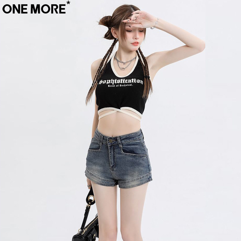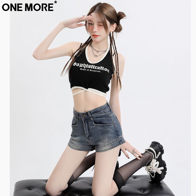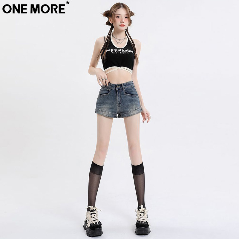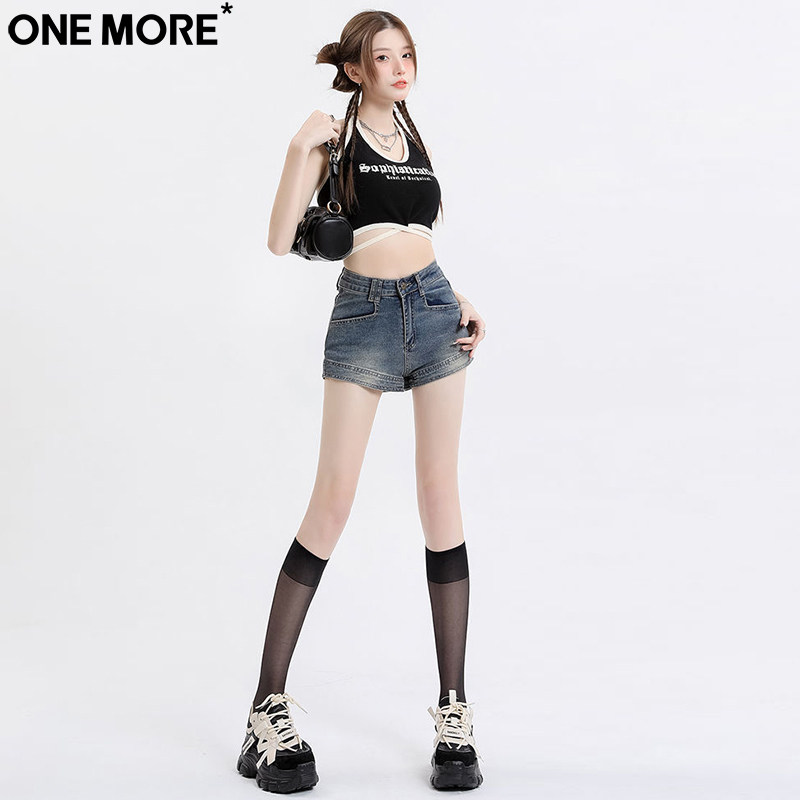 One More美式弹力高腰外穿牛仔短裤女夏季新款复古包臀显瘦热裤子