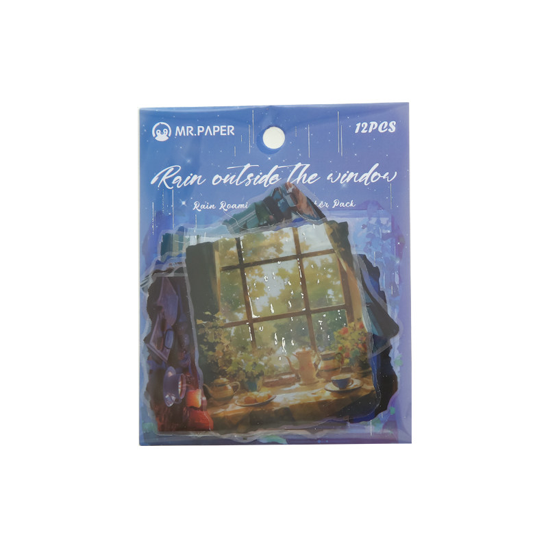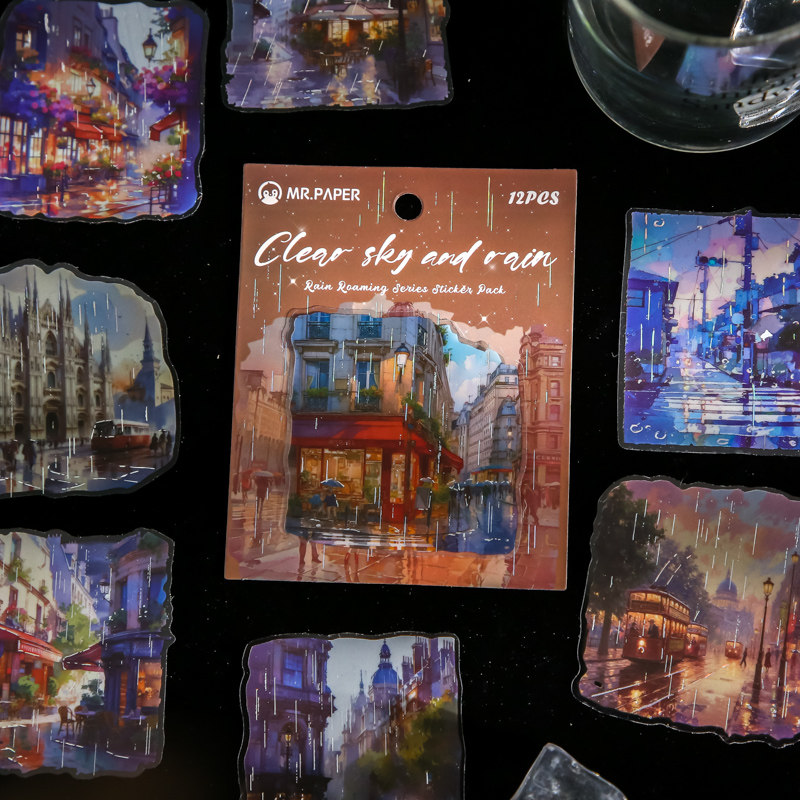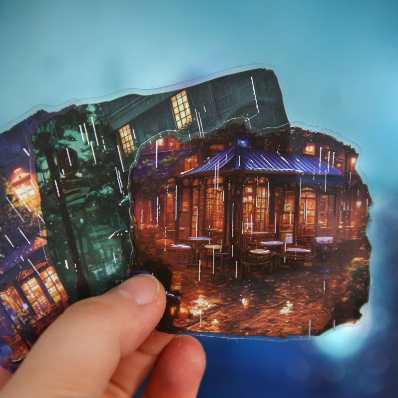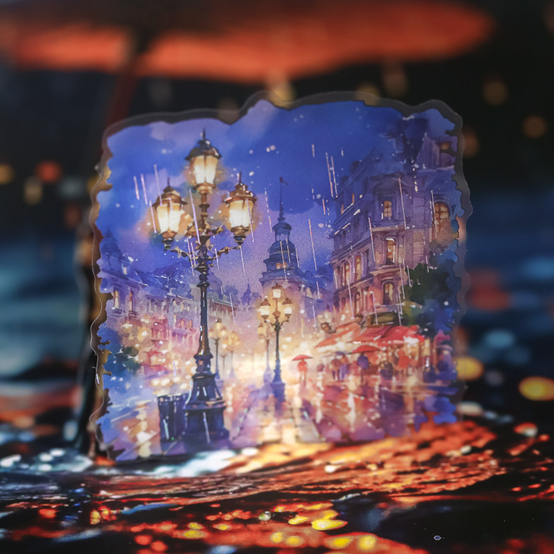雨中漫步PET镭射烫银大贴纸包雨天城市街景复古手帐造景素材贴画