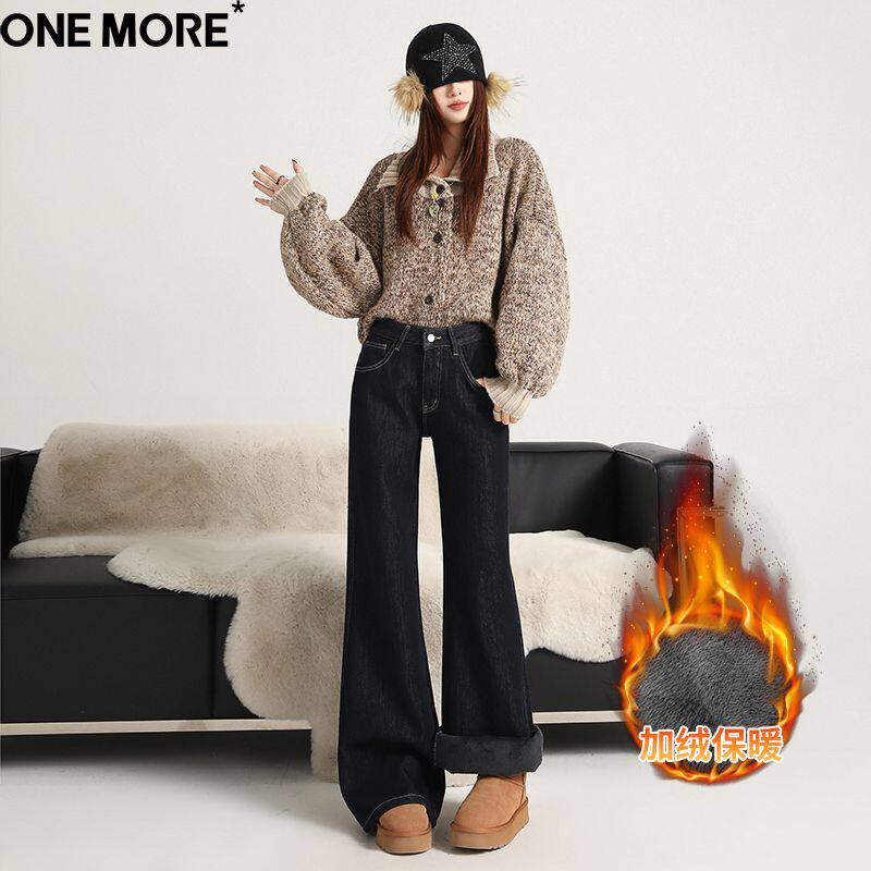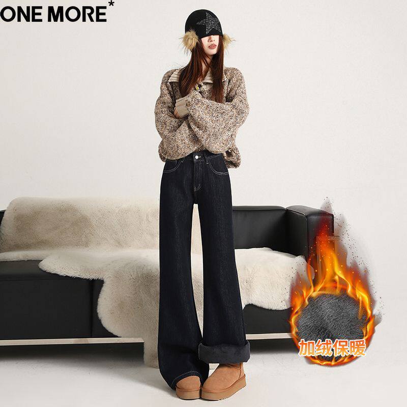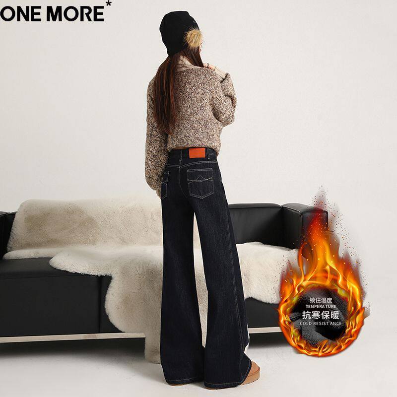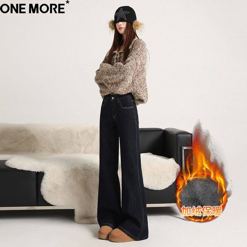 One More辣妹低腰微喇加绒牛仔裤女冬季深蓝色加厚宽松阔腿喇叭裤