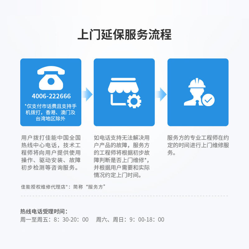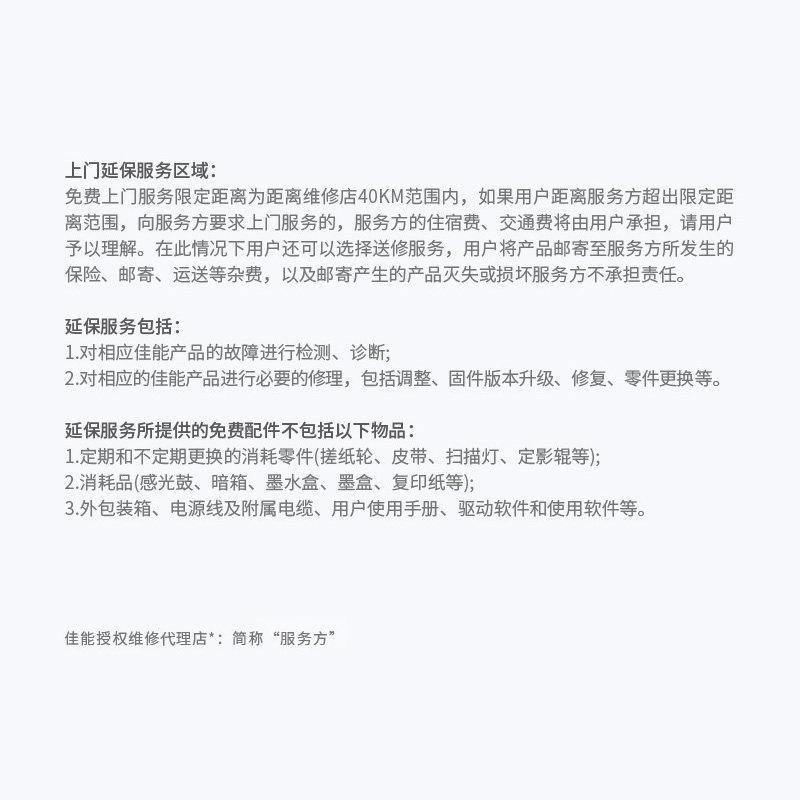 Canon佳能激光打印机打印复印扫描传真多功能一体机保修服务:标准1年送修+2年官方延保=3年有限距离上门维修