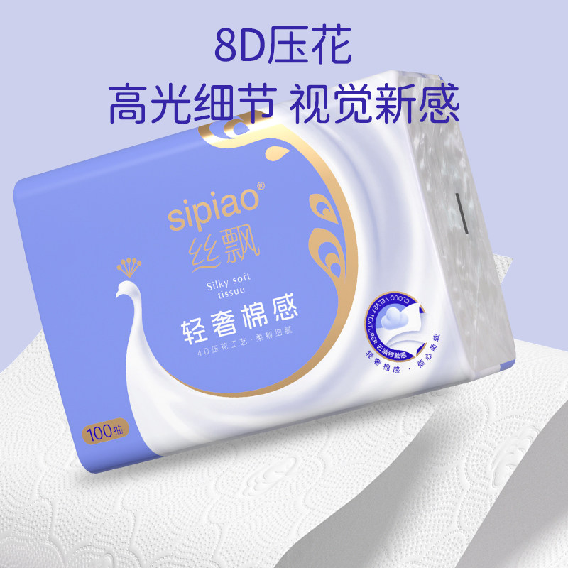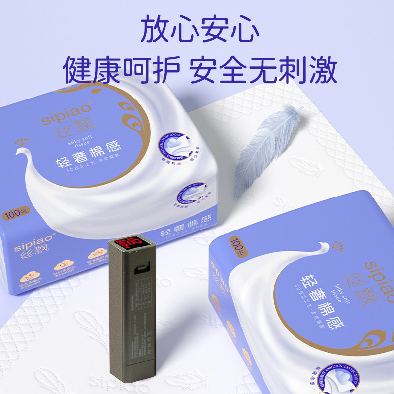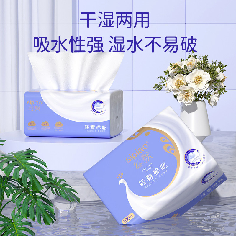 丝飘抽纸100抽加厚可湿水优等品干湿两用家用抽取式实惠装面巾纸