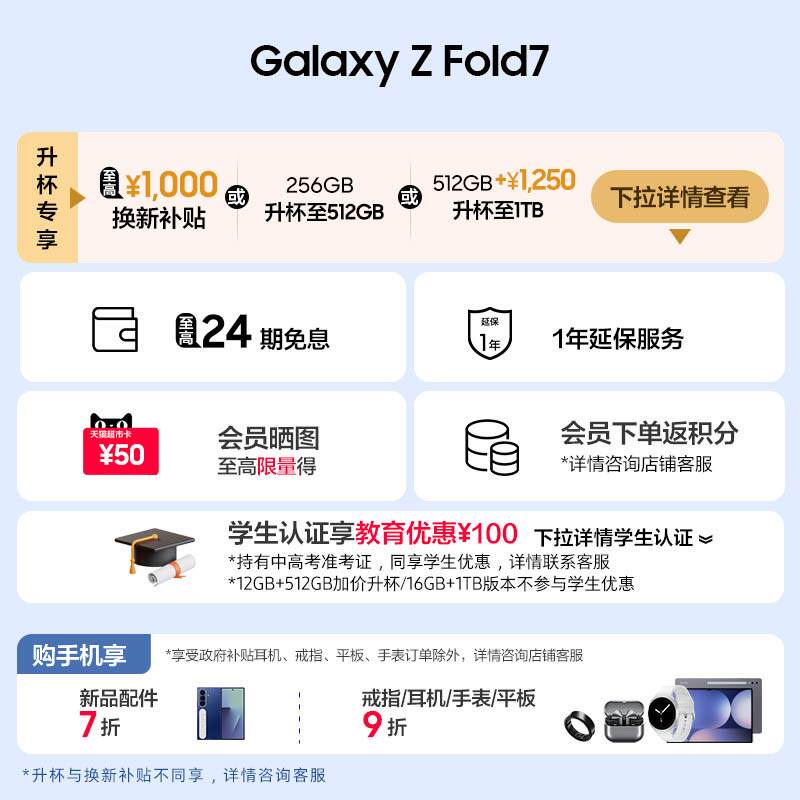 【享24期免息】Samsung/三星 Galaxy Z Fold7超轻薄折叠屏旗舰AI手机 2亿像素骁龙8至尊版