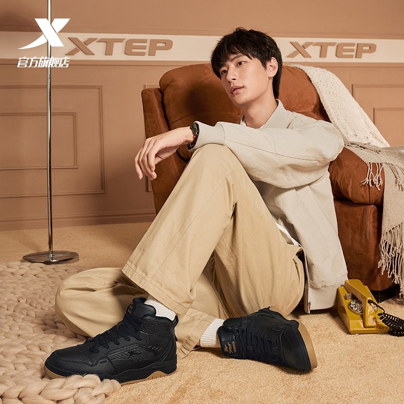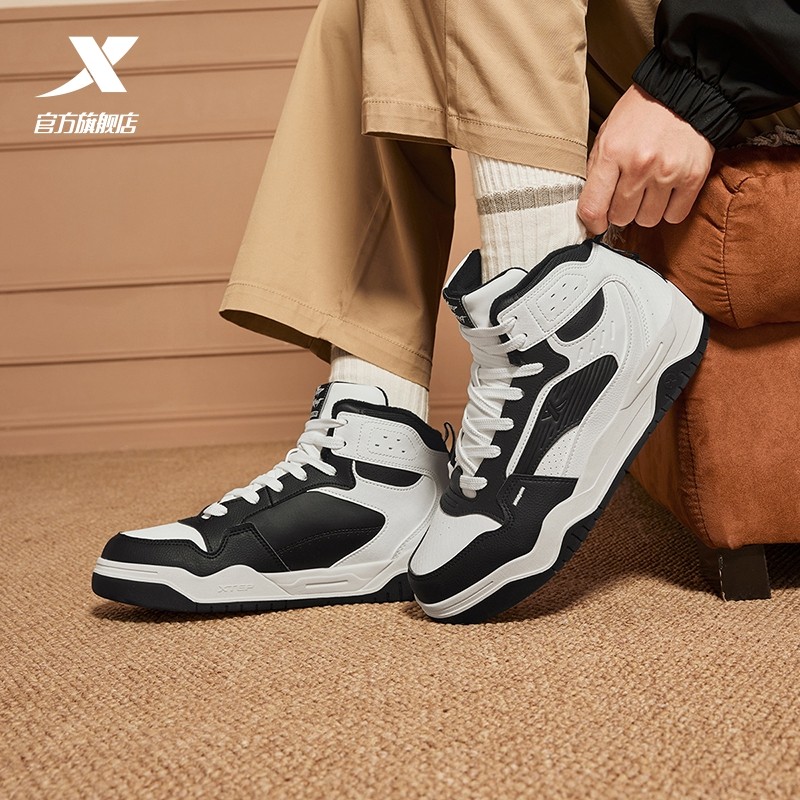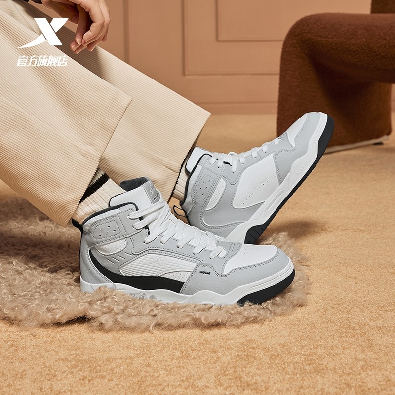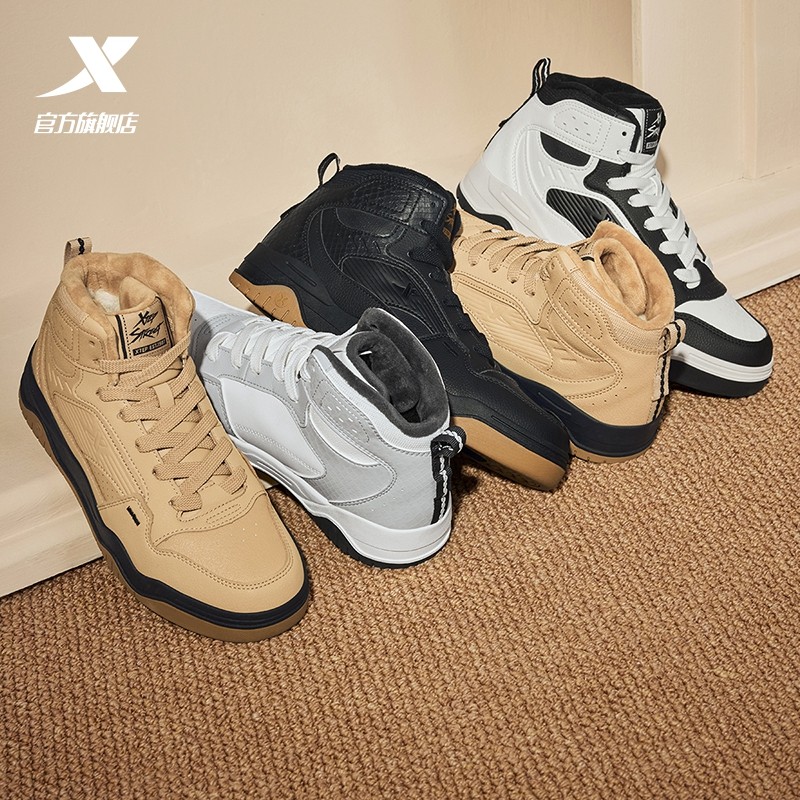 特步皓白板鞋女鞋秋冬皮面休闲鞋复古高帮加绒保暖棉鞋运动鞋男款