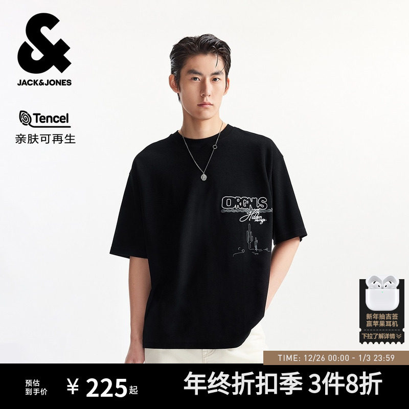 杰克琼斯男装秋季新款T恤百搭精致刺绣经典黑色舒适宽松圆领短袖