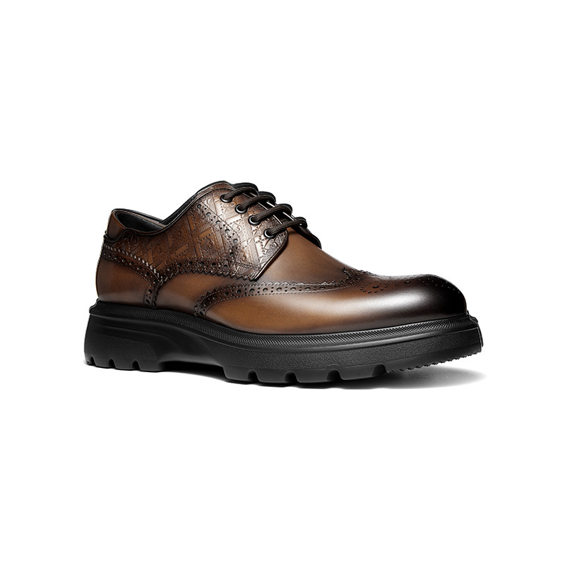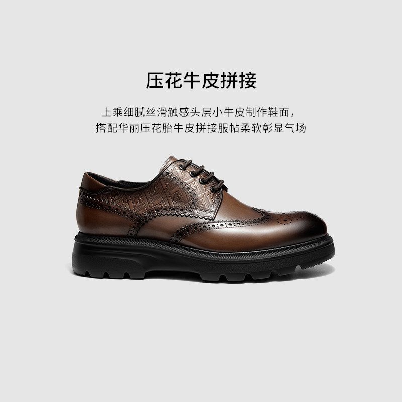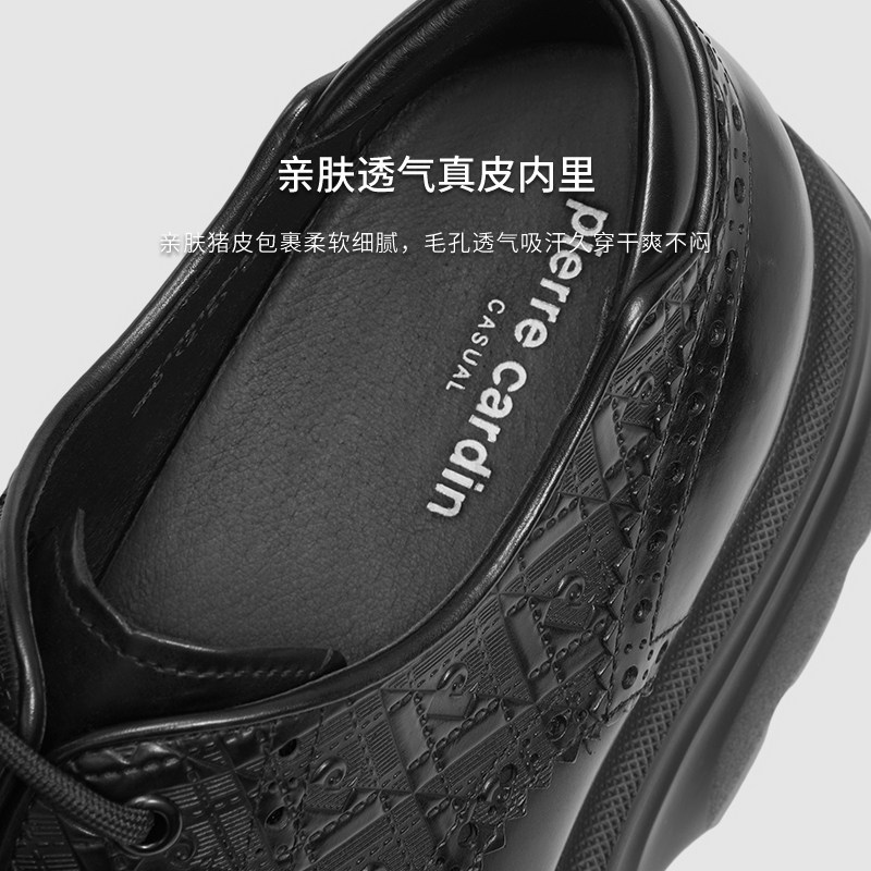 皮尔卡丹男鞋压花雕刻XL发泡厚底舒适商务系带布洛克真皮德比鞋男
