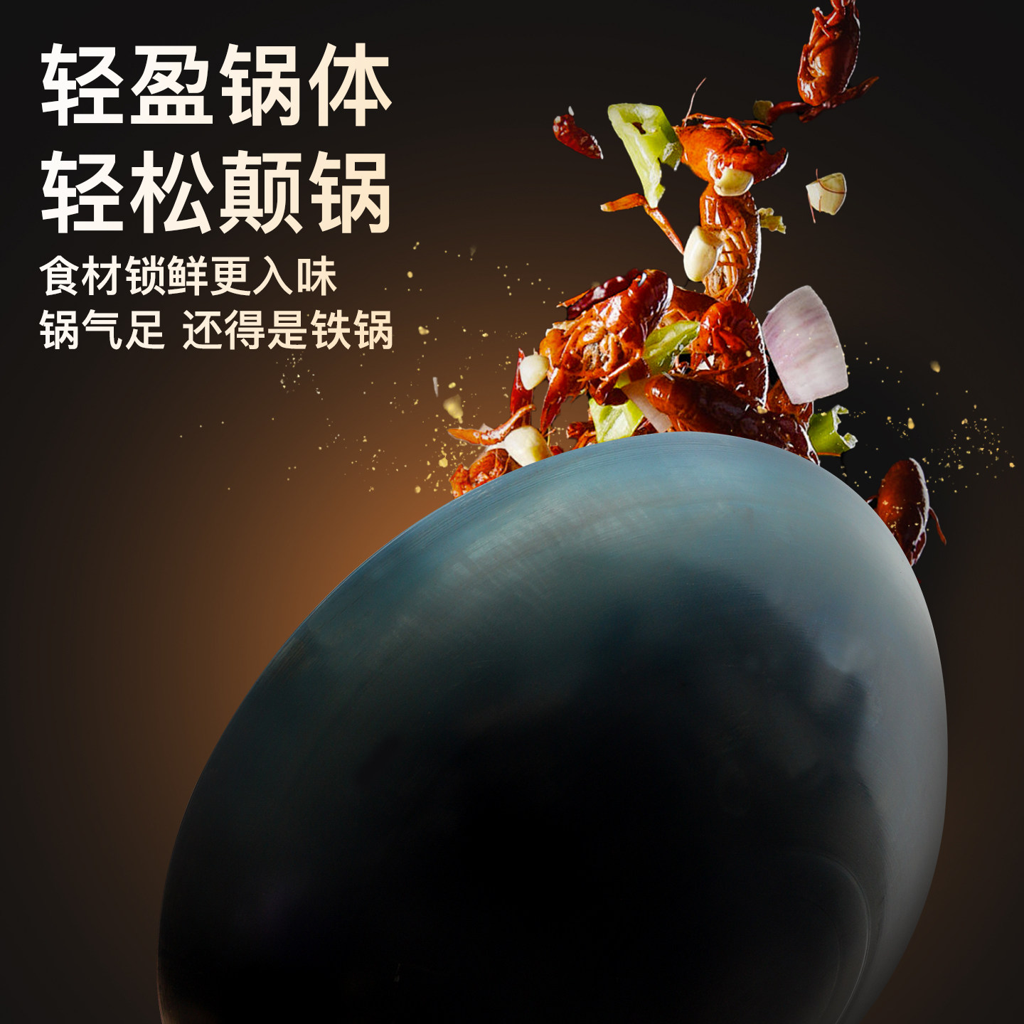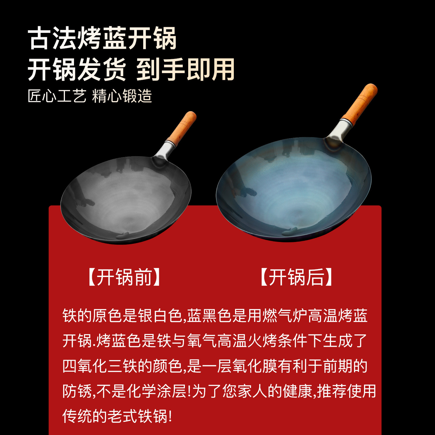 圆底铁锅无涂层炒锅不粘锅家用炒菜锅厨师锅烤蓝已开锅商用轻便