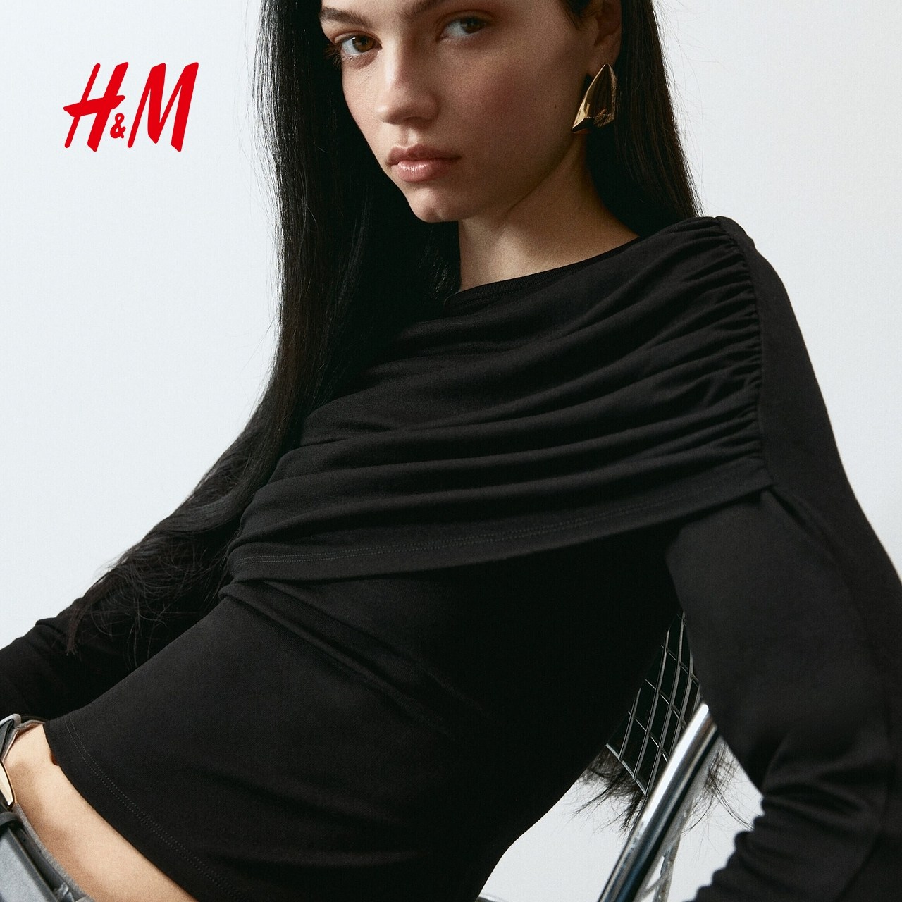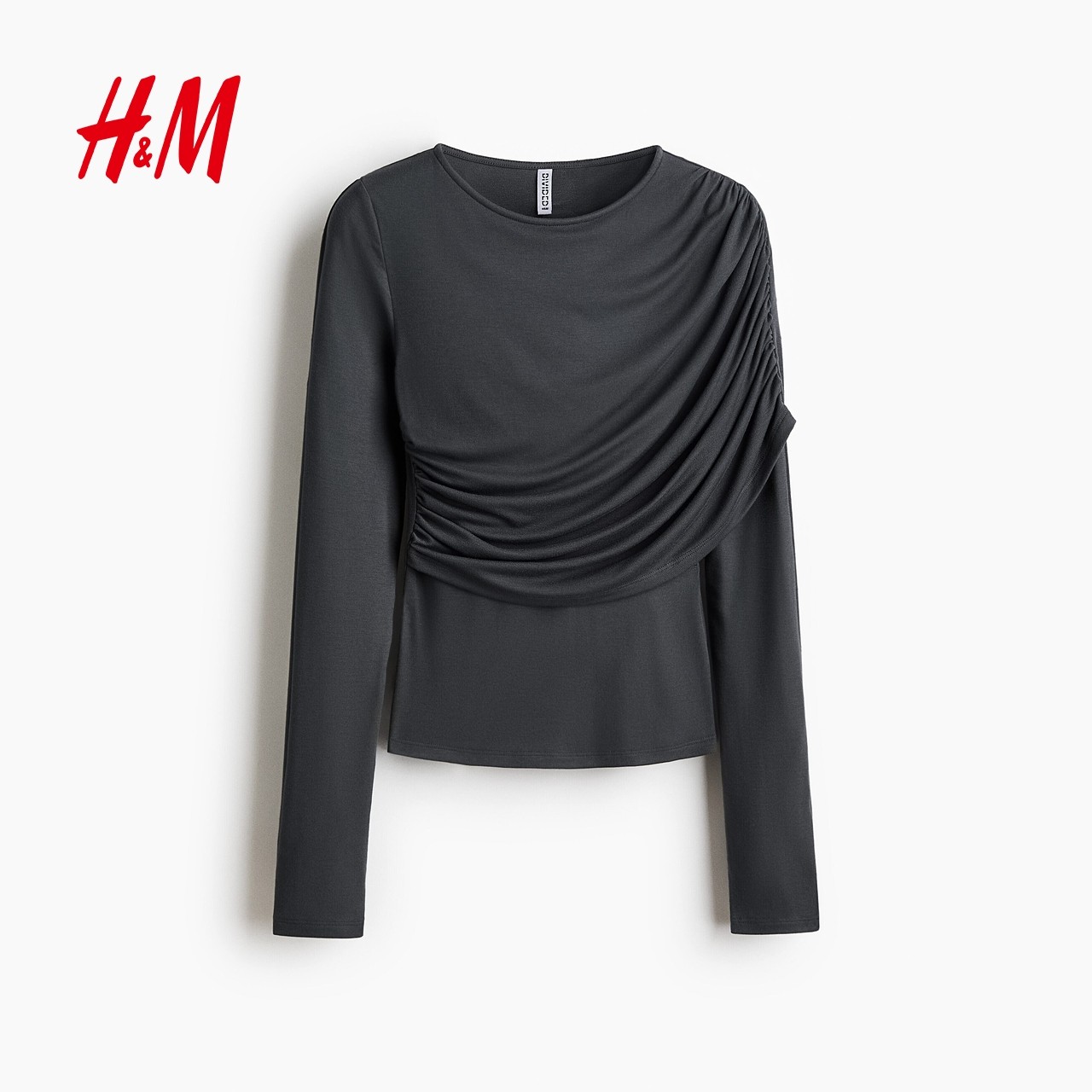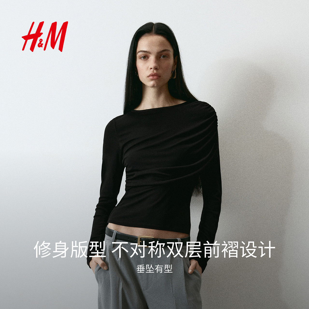 HM女装T恤2026春季新款长袖设计感时尚内搭垂褶粘纤上衣1320233
