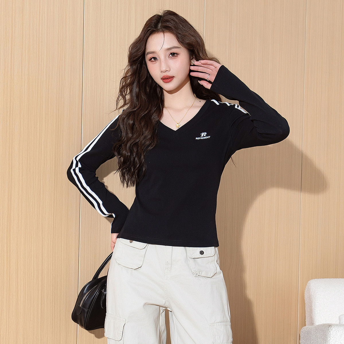 唐狮女V领袖子织带长袖T恤打底衫内搭红色流行爆款上衣女装TD
