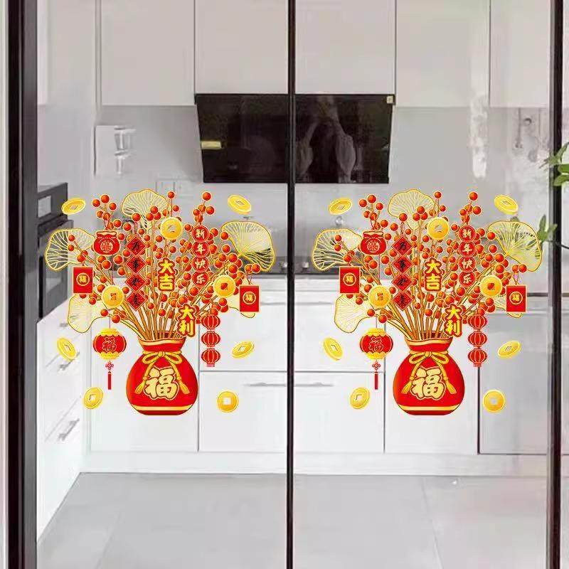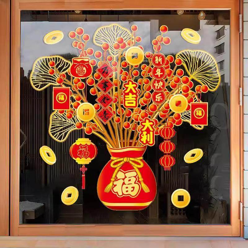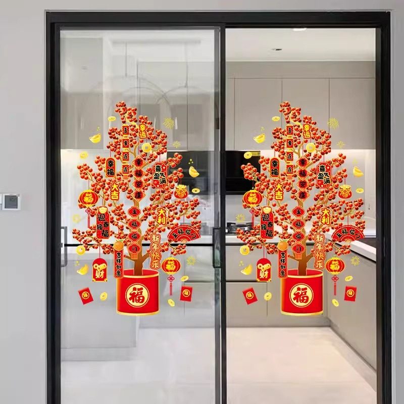 2025新年过年装饰发财树窗花贴福字门贴玻璃贴纸蛇年春节静电贴画
