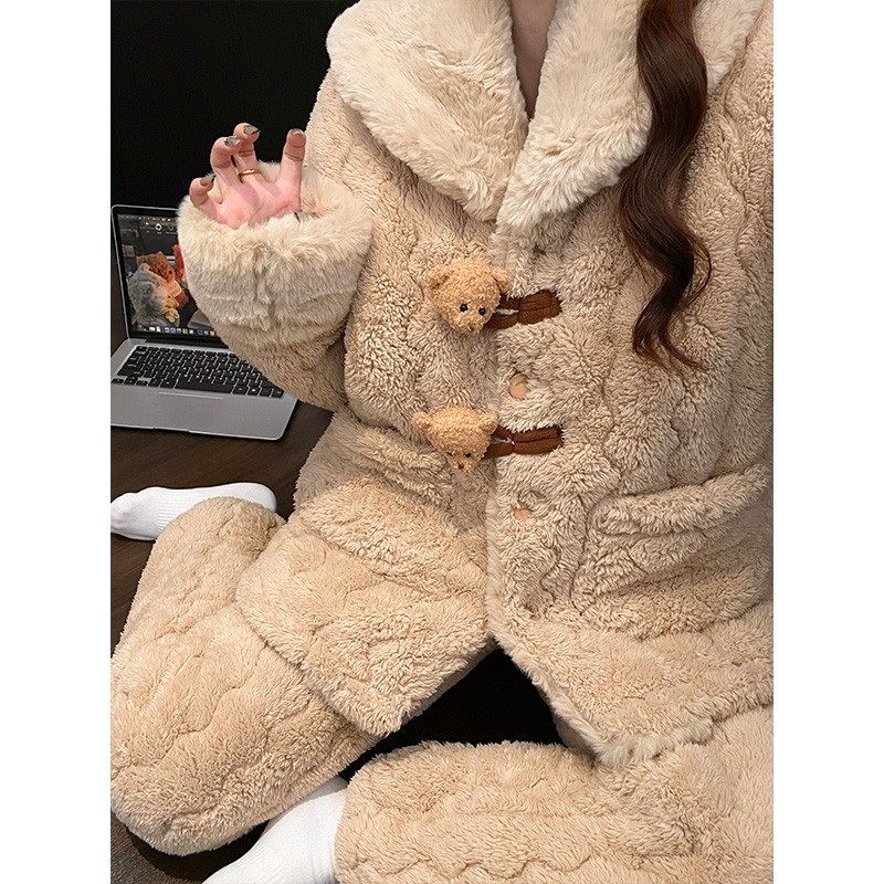 三层夹棉睡衣女秋冬季加绒加厚珊瑚绒可爱少女生冬天家居服可外穿
