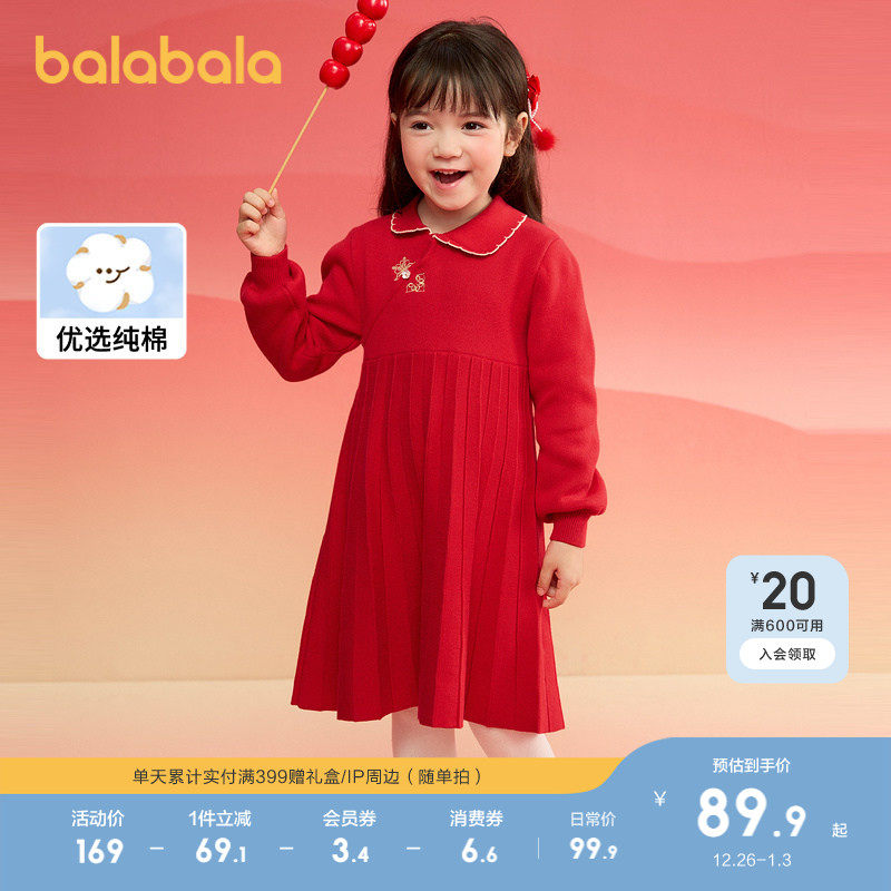 巴拉巴拉女童新中式针织连衣裙2025春秋装新款红色百褶公主甜裙子