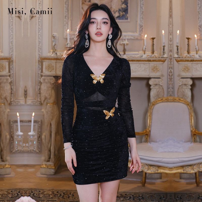 Misi.Camii2024秋冬新款女装时尚修身显瘦繁星烫钻丝绒短款连衣裙