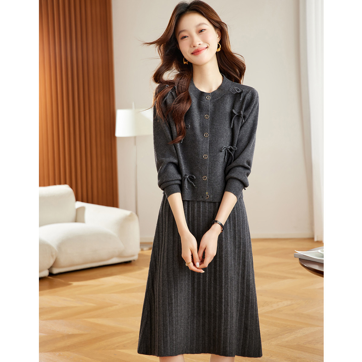 雪中飞【两件套】女士连衣裙洋气时尚圆领毛衣裙甜美可爱套装W