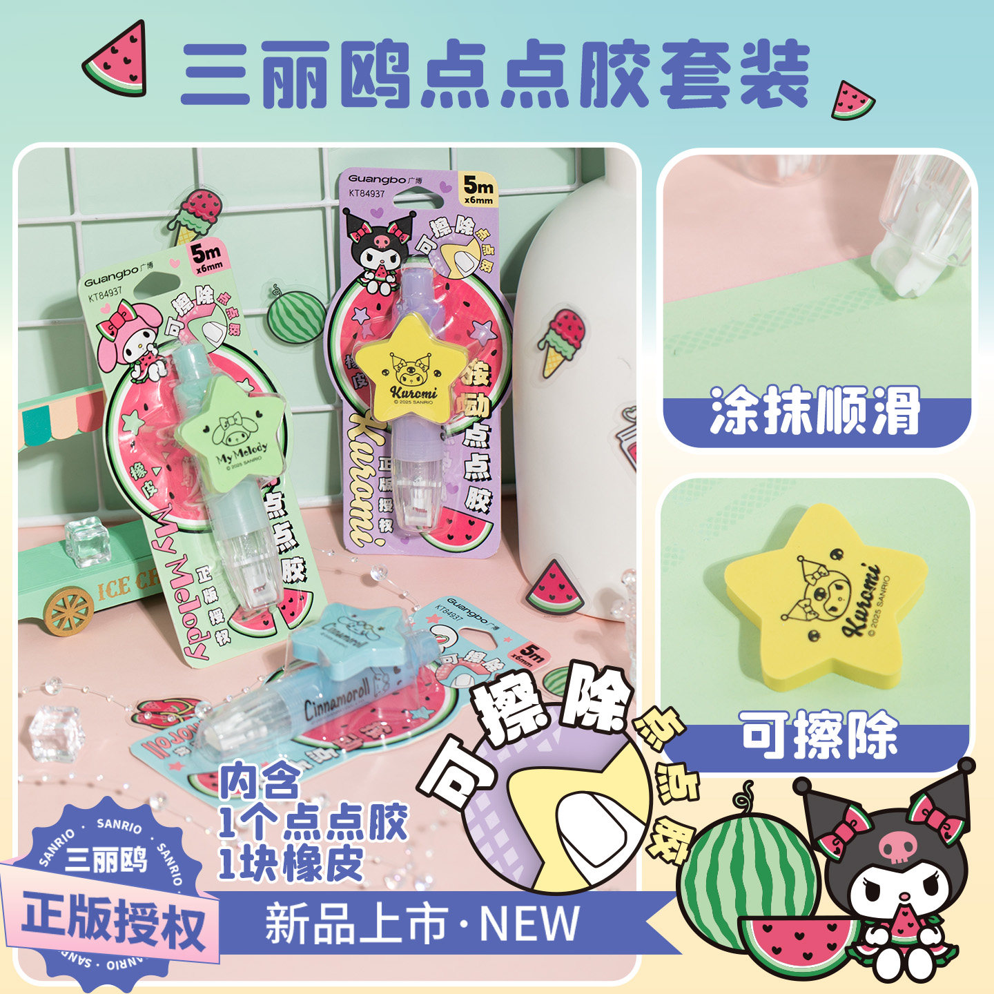 广博三丽鸥按动点点胶小学生专用大容量库洛米可擦点点胶笔高颜值ins风可替换芯幼儿园手工无痕胶水双面胶