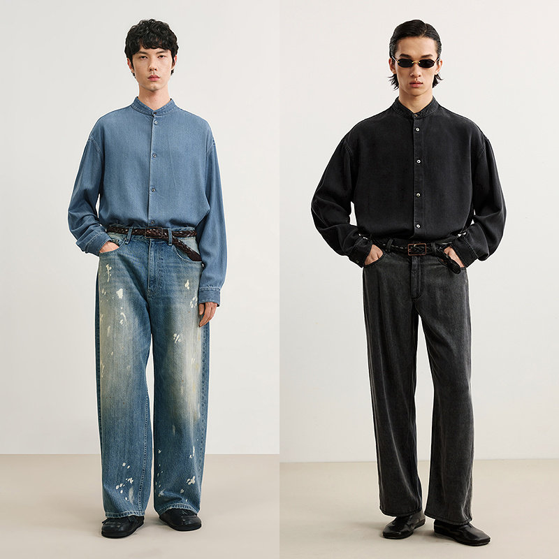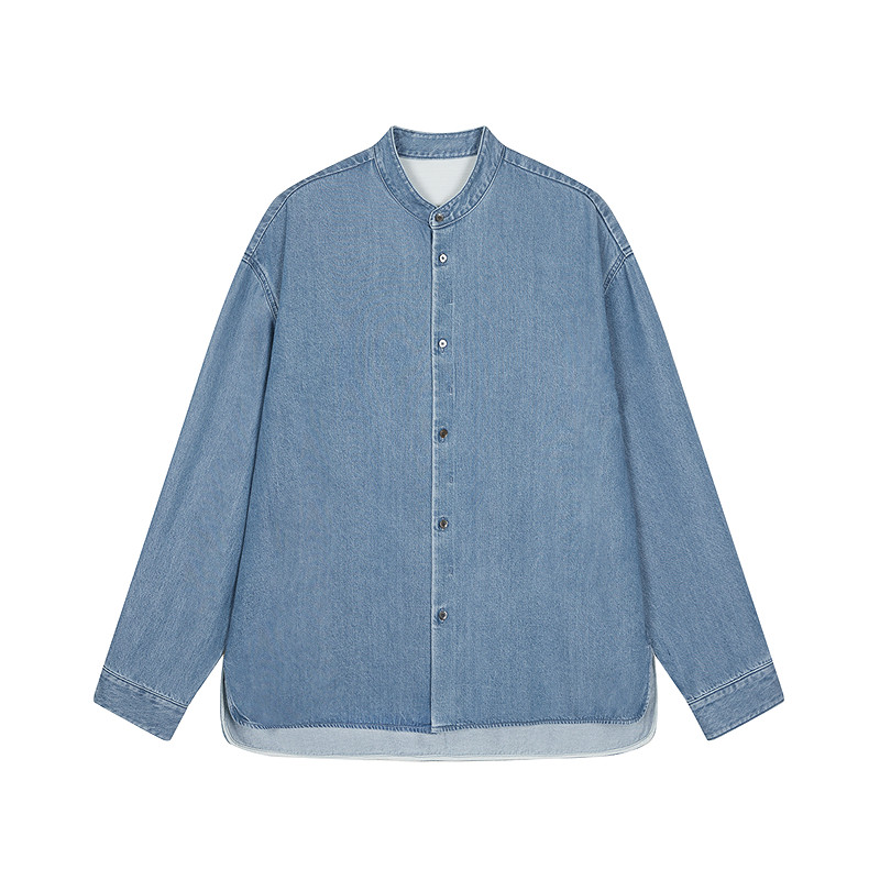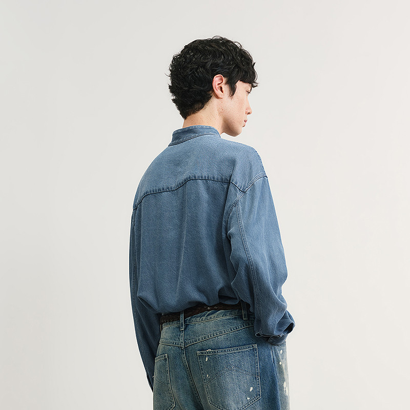 速写男装春秋新款男士衬衫莱赛尔牛仔长袖衬衫立领纯色简约通勤