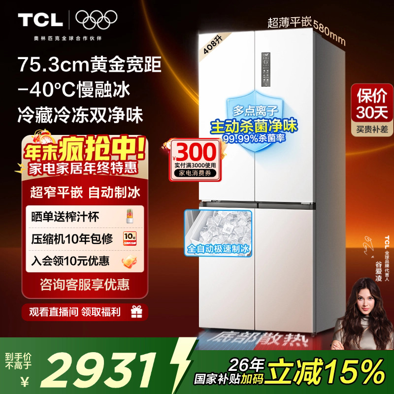 TCL冷布丁408升十字四开门电冰箱超窄超薄小户型零嵌全自动制冰