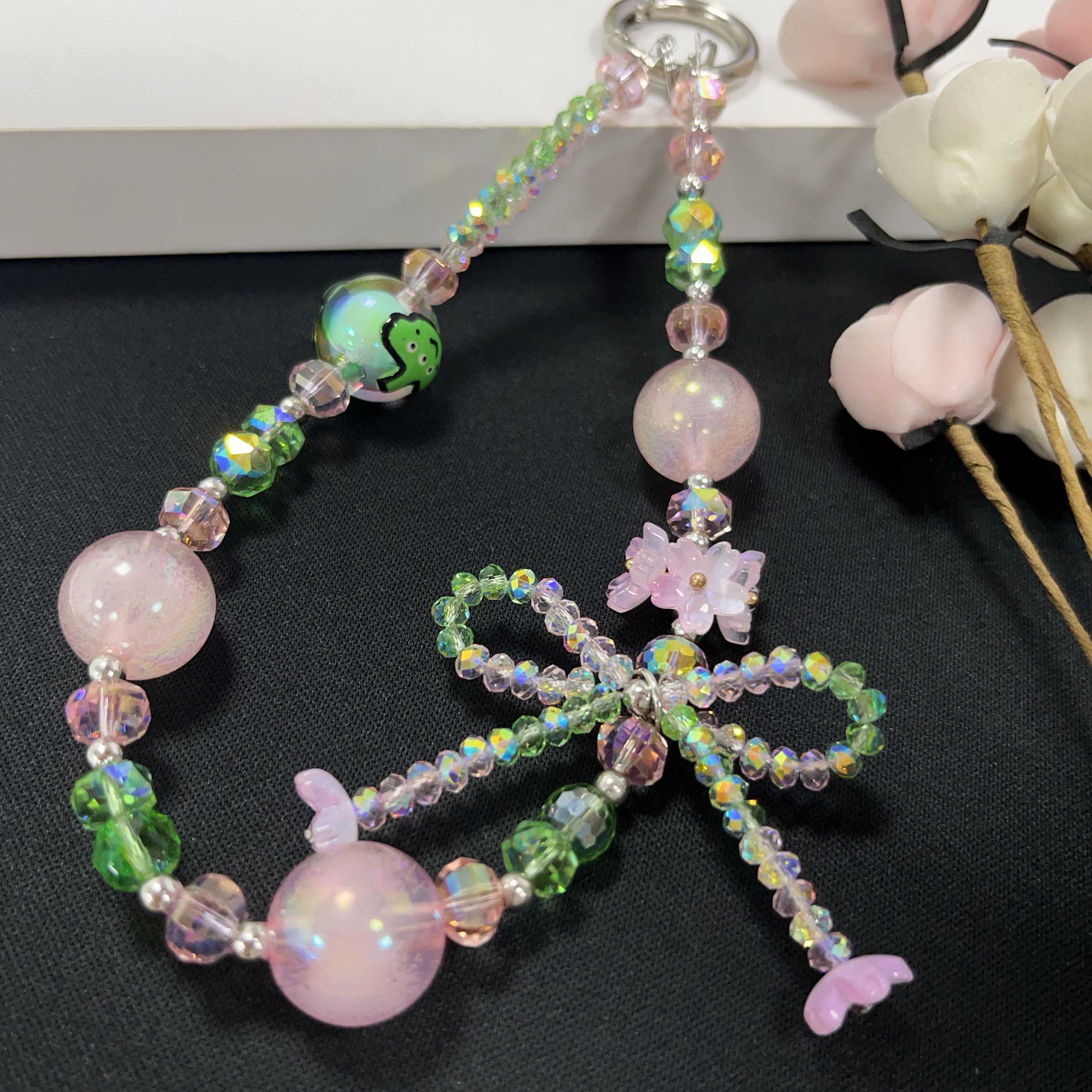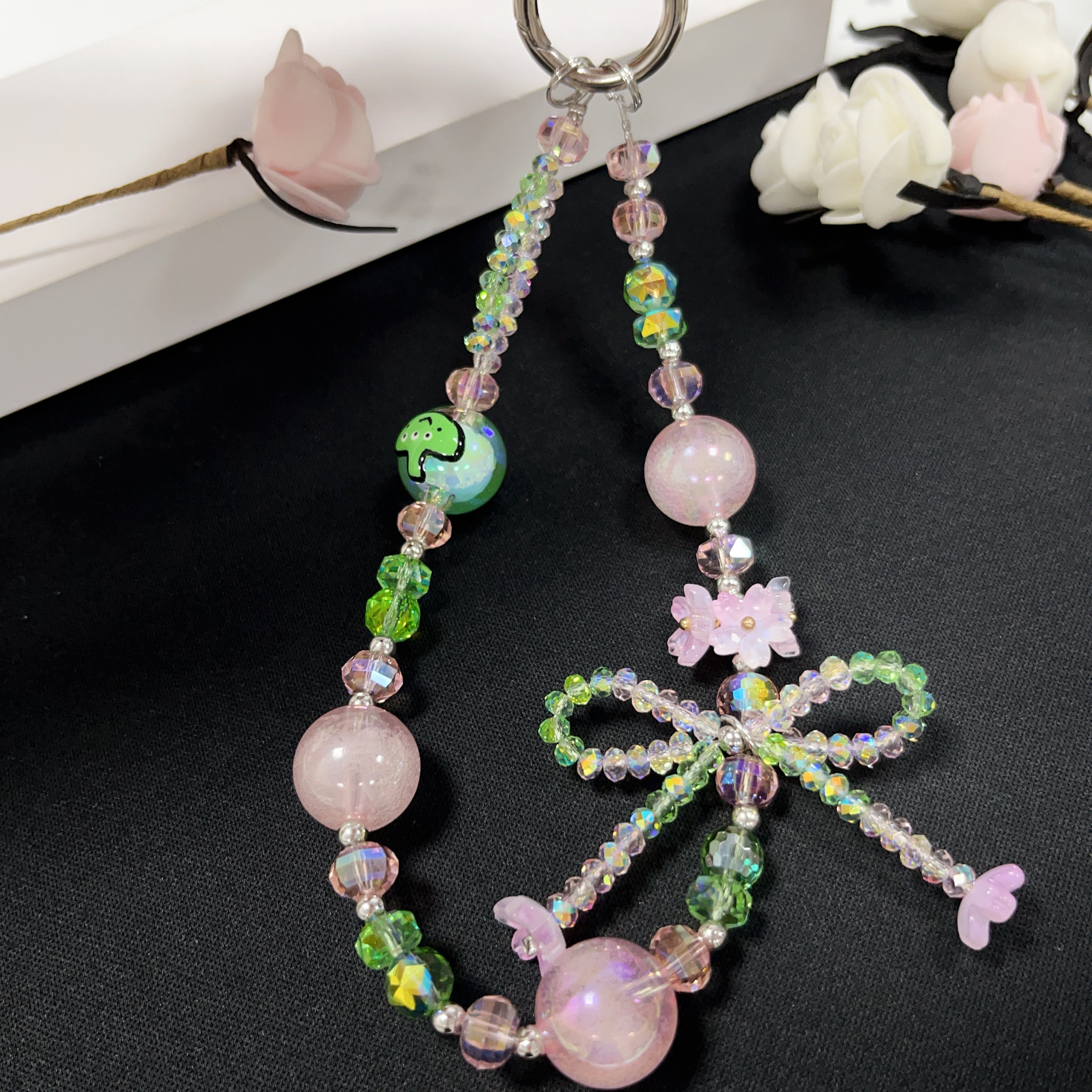 新款创意绿色手绘珠花朵水晶高级感蝴蝶结DIY手工串珠大珠珠少女粉手机壳配饰防摔防丢失结实耐用手机壳挂饰