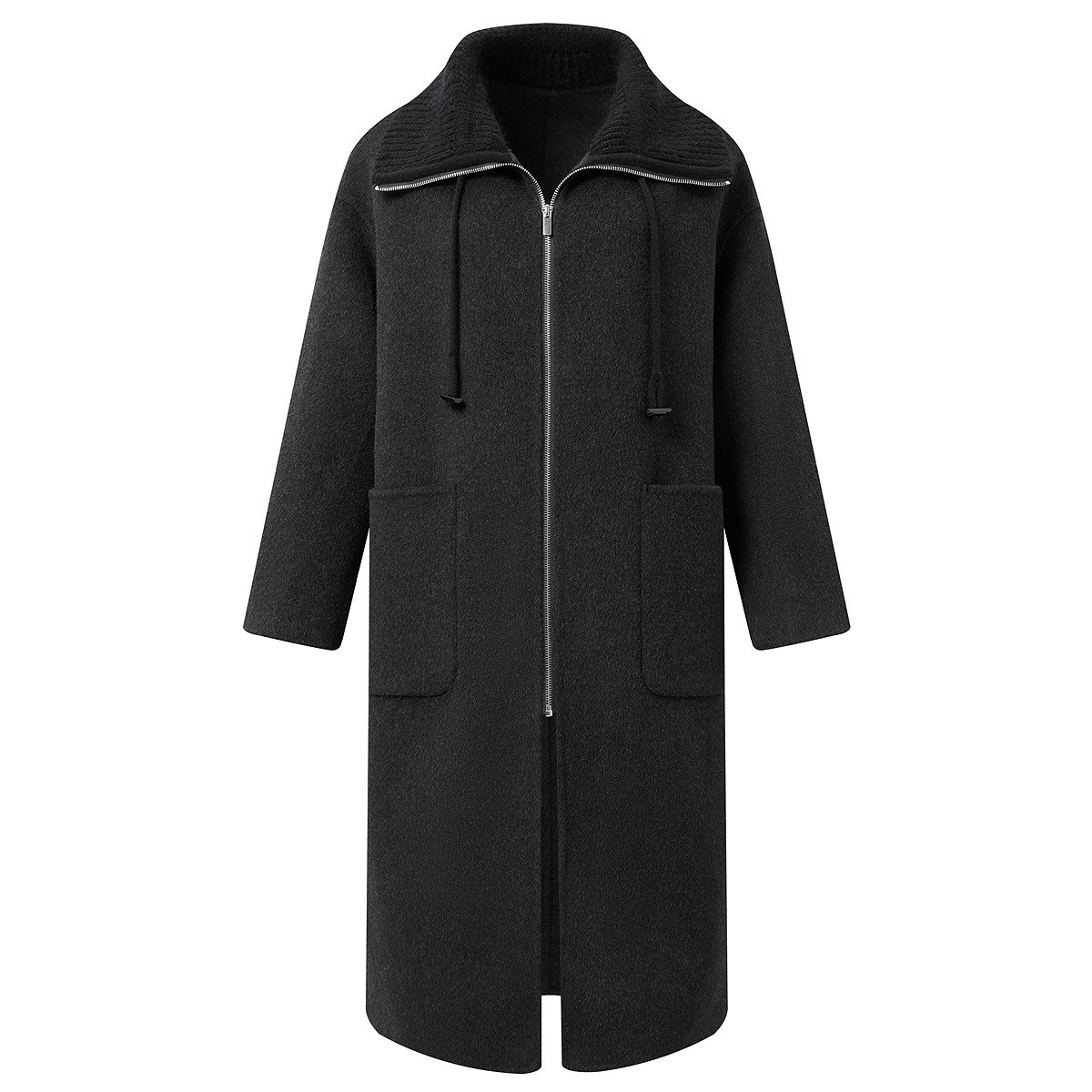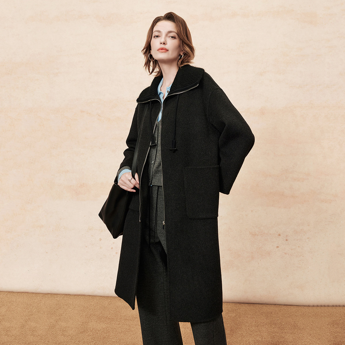 FINITY菲妮迪毛呢外套2025年冬季新款简约双面呢黑色长款大衣女士