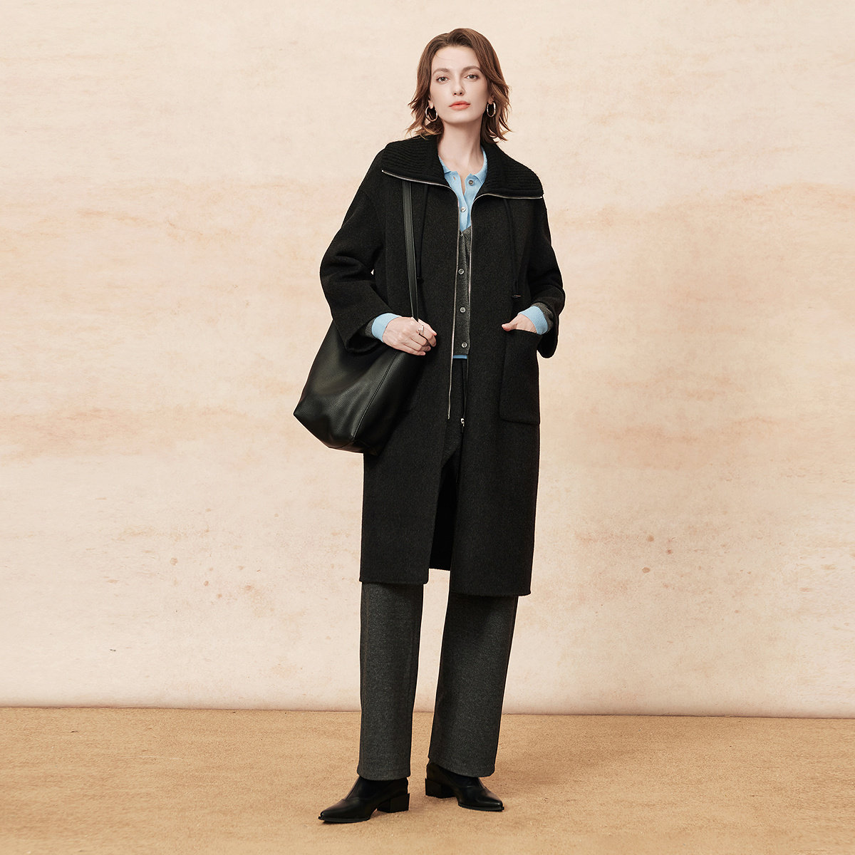 RUISHI芮时重磅驼绒桑蚕丝羊毛慵懒两穿领灰色毛呢大衣秋冬外套女