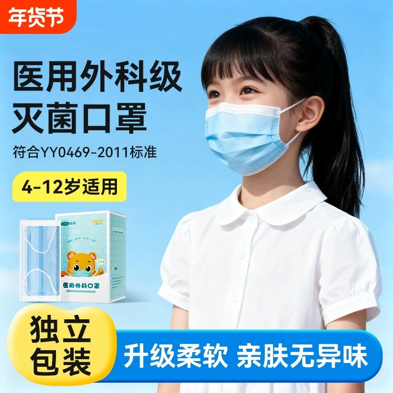 初医生医用外科口罩儿童8到12岁5小孩宝宝3到6岁上学专用独立包装