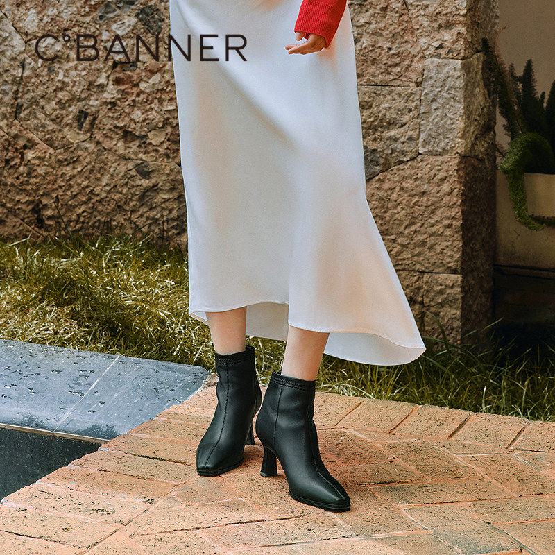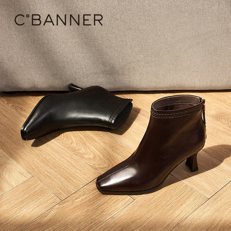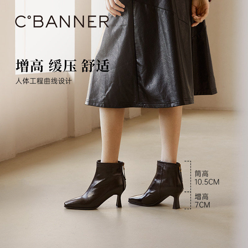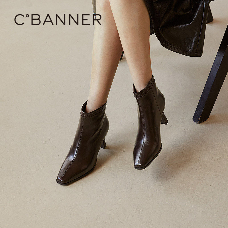 千百度粗高跟羊皮靴女2025秋冬新款时装靴通勤尖头显瘦法式短靴子