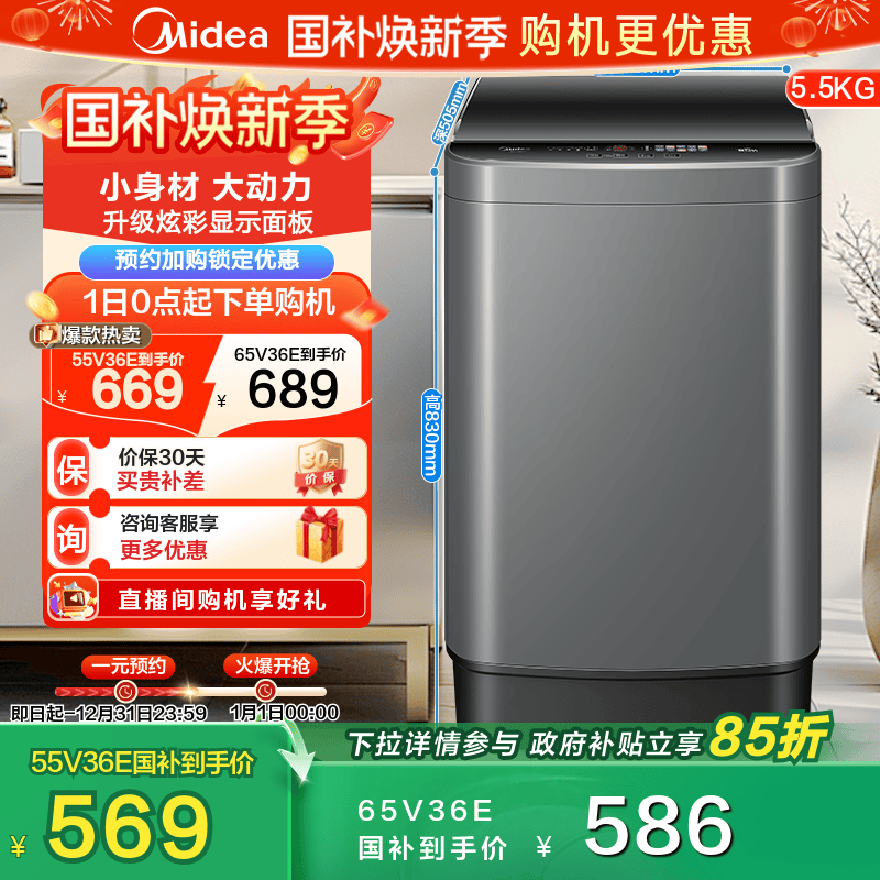 以旧换新补贴美的5.5/6.5kg洗衣机全自动小型租房洗脱一体波轮36E