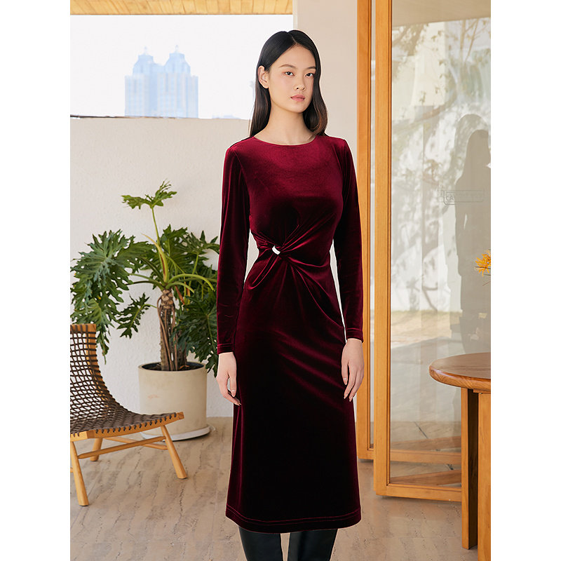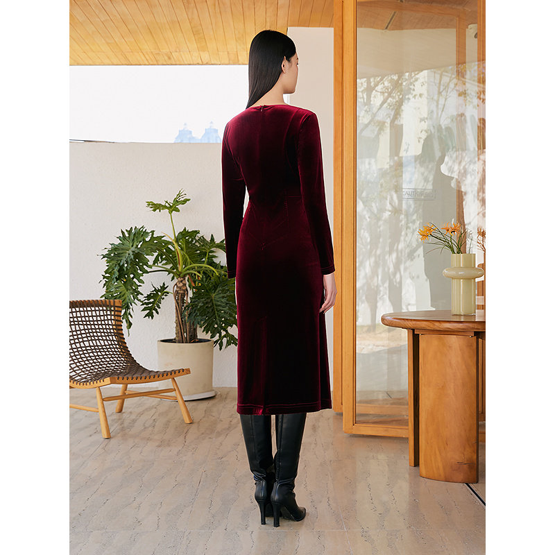 YINER音儿专选2025冬季新款法式优雅奢感皱褶收腰丝绒连衣裙