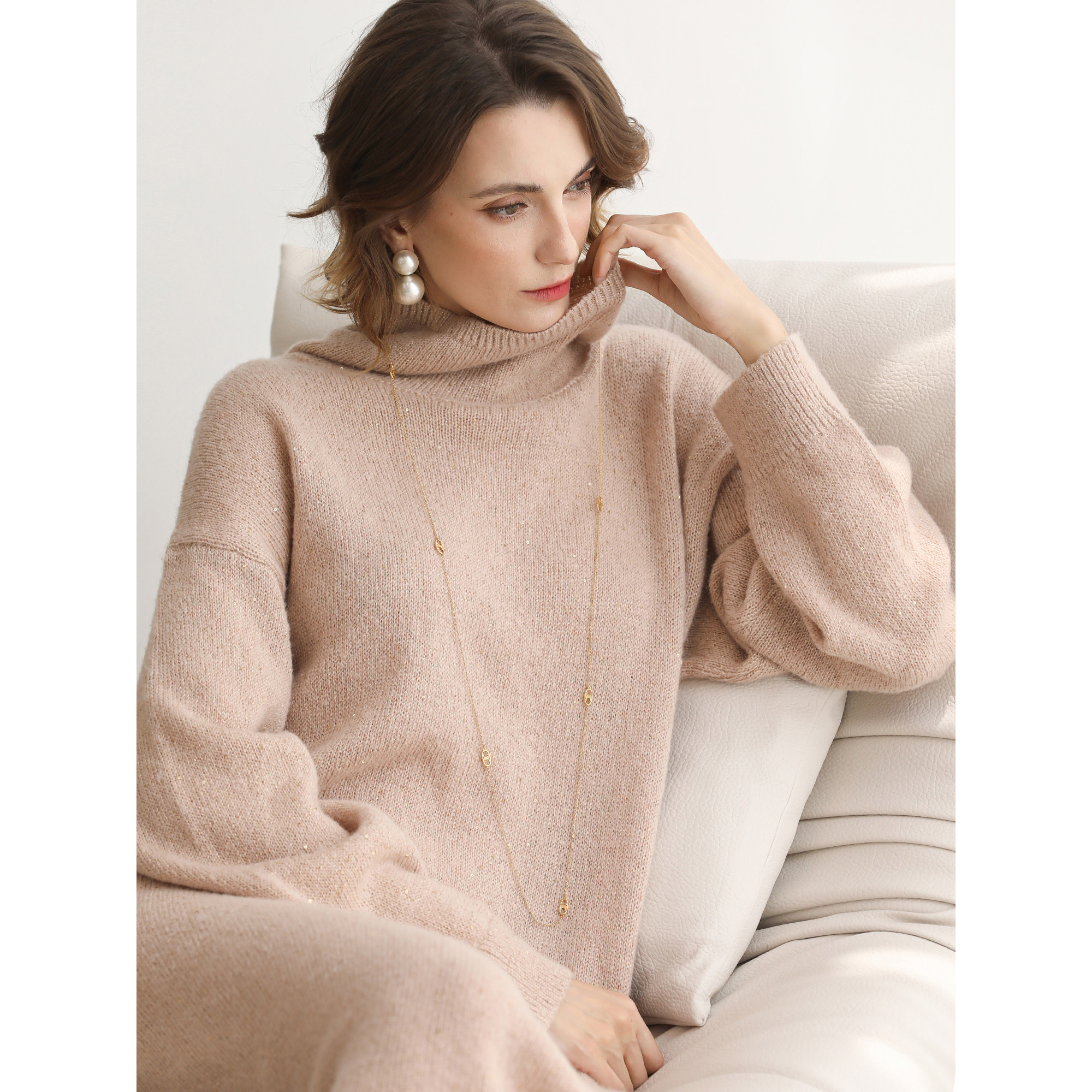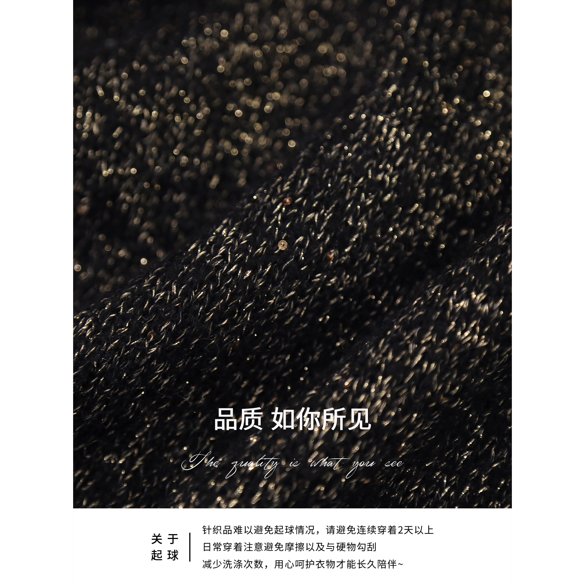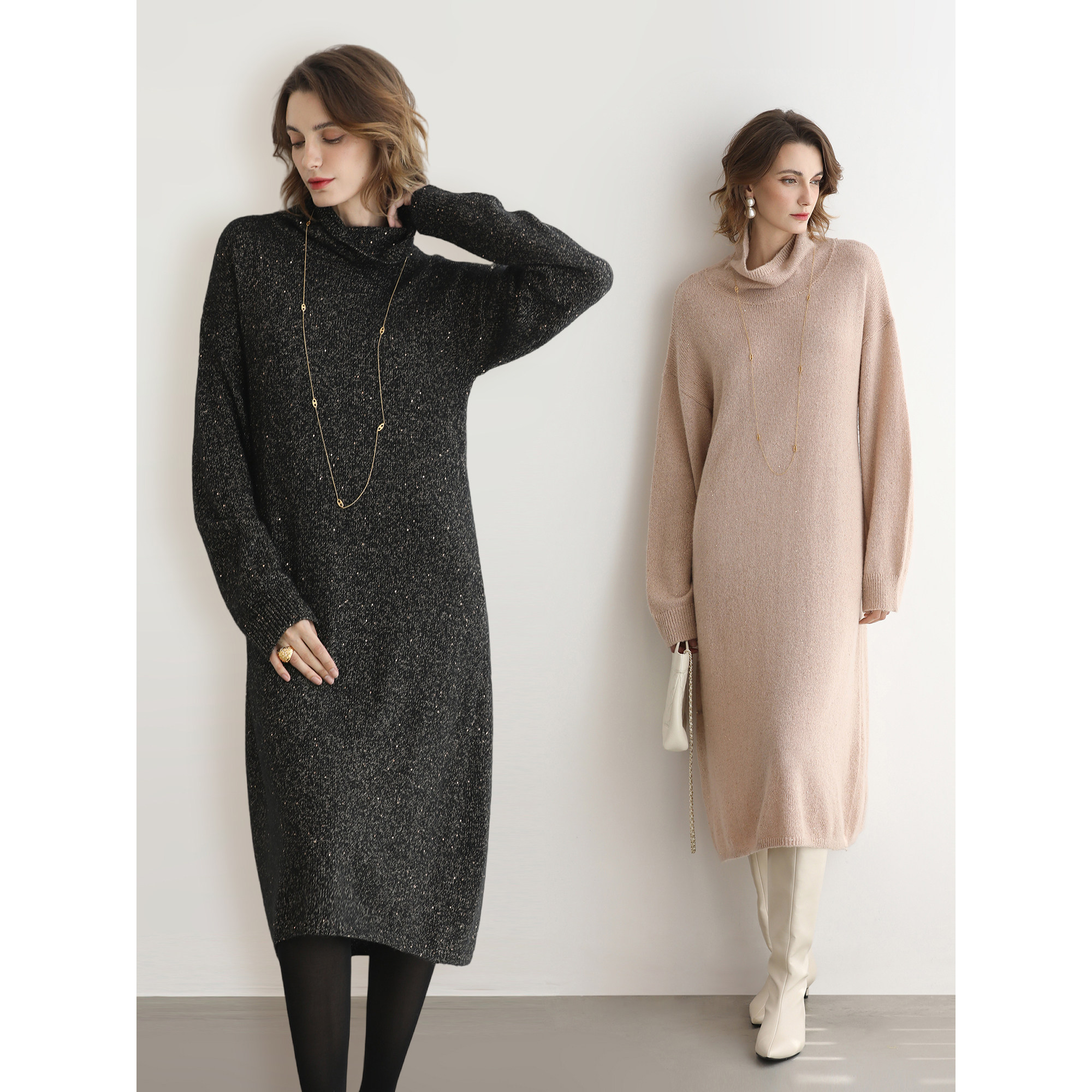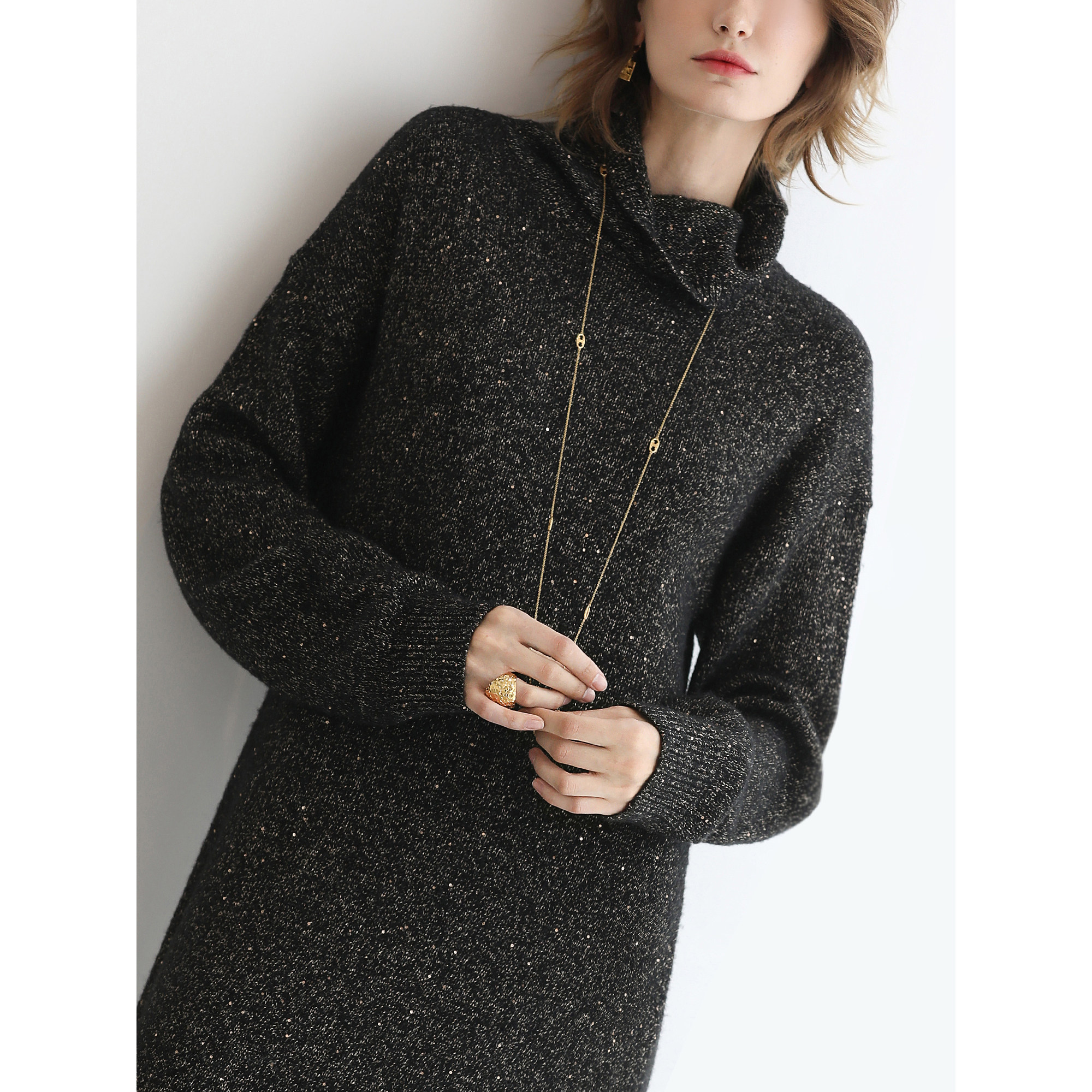 COCOBELLA秋冬新款黑色亮片长款毛衣裙女高领连衣裙FR3066-2