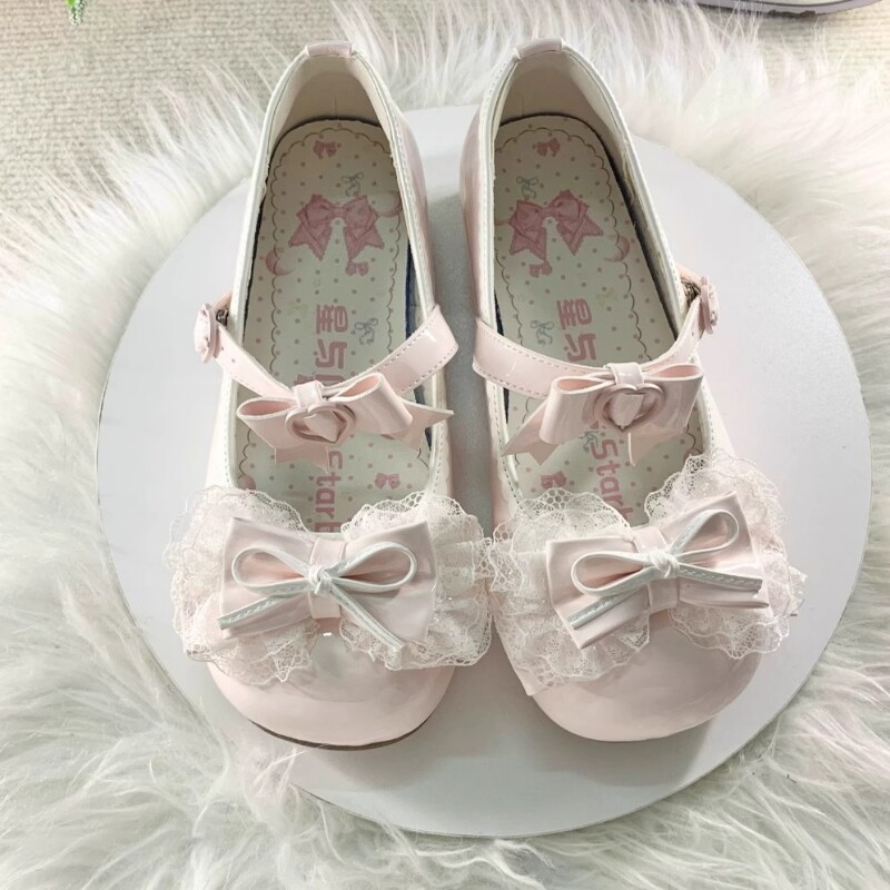 原创lolita鞋子蕾丝蝴蝶结芭蕾圆头低跟洛丽塔小皮鞋JK粉色单鞋女