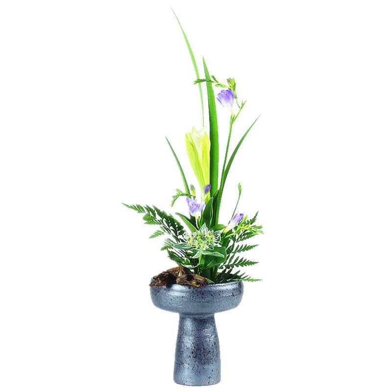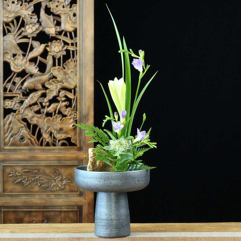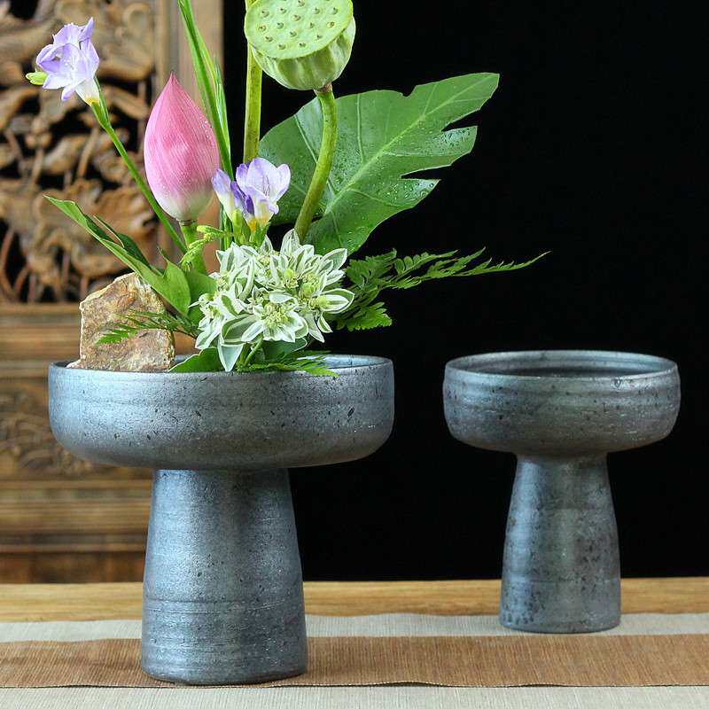 手作粗陶高脚花盆复古仿旧插花器茶室客厅装饰摆件花盘果盘