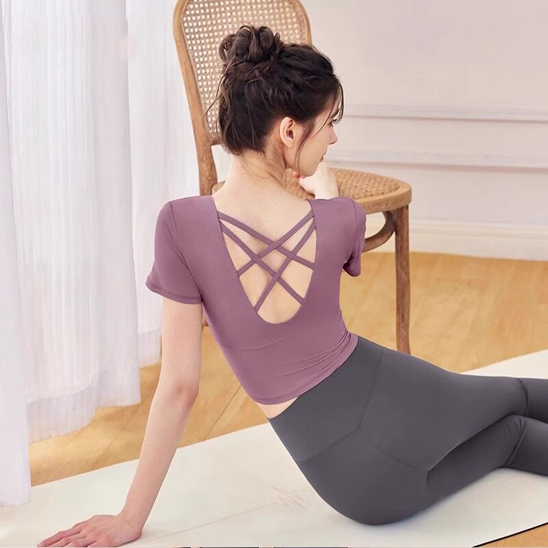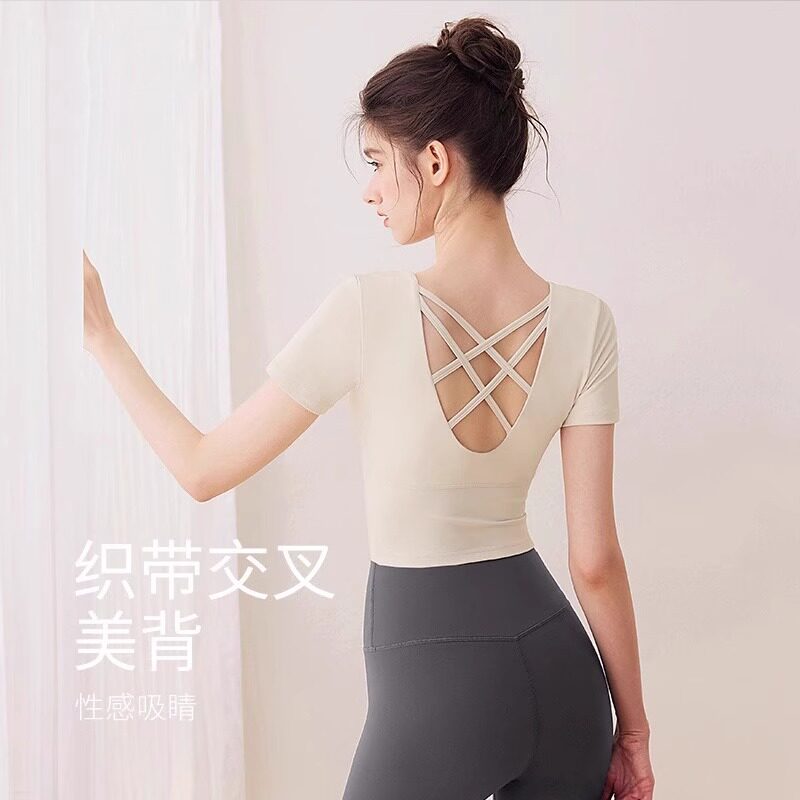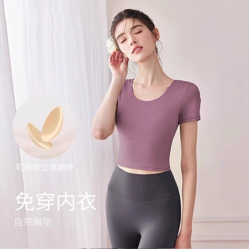 2025薄款运动女上衣瑜伽服新款普拉提训练带胸垫健身衣夏短袖套装