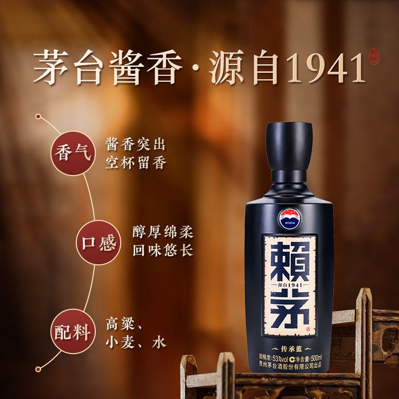 贵州赖茅传承蓝酱香型高端纯粮食高粱白酒礼盒装53度500ml*1瓶
