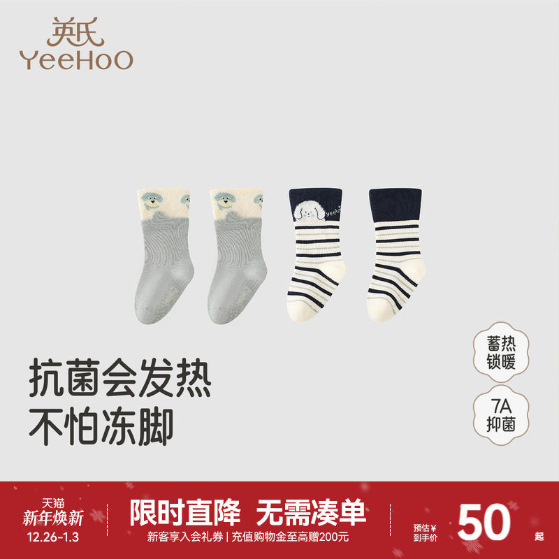 【商场同款】英氏婴儿袜子7A抗菌发热纱秋冬款保暖不勒腿儿童短袜
