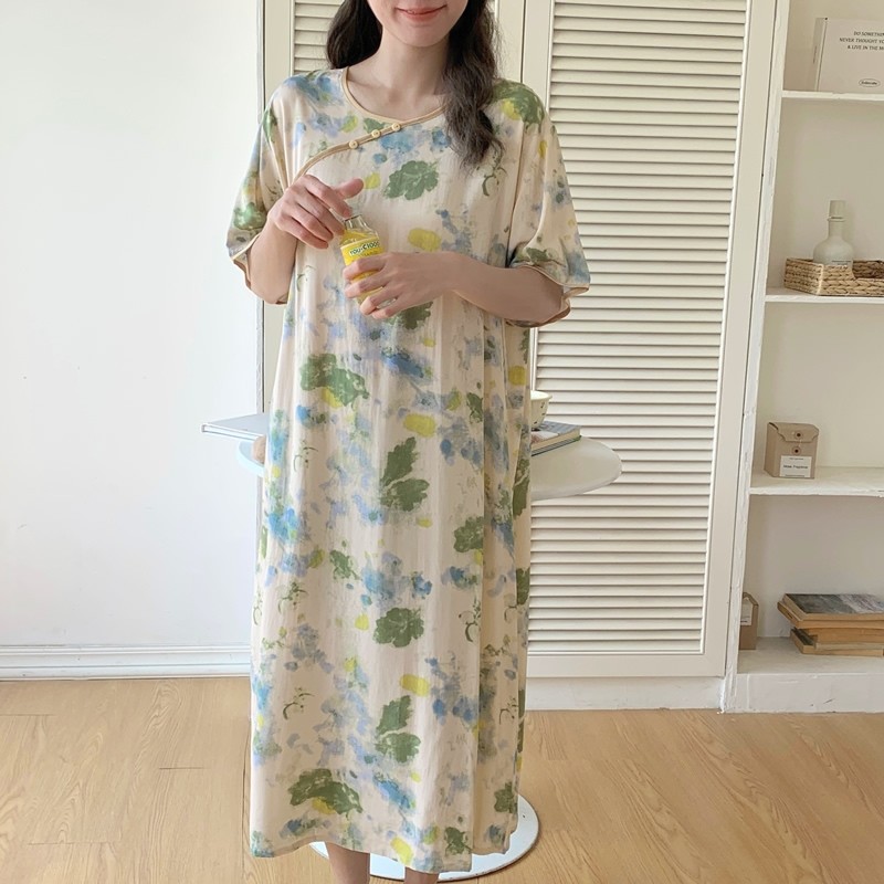 棉绸睡裙女夏新中式国风连衣裙旗袍式睡衣系龄大码长款家居服薄款