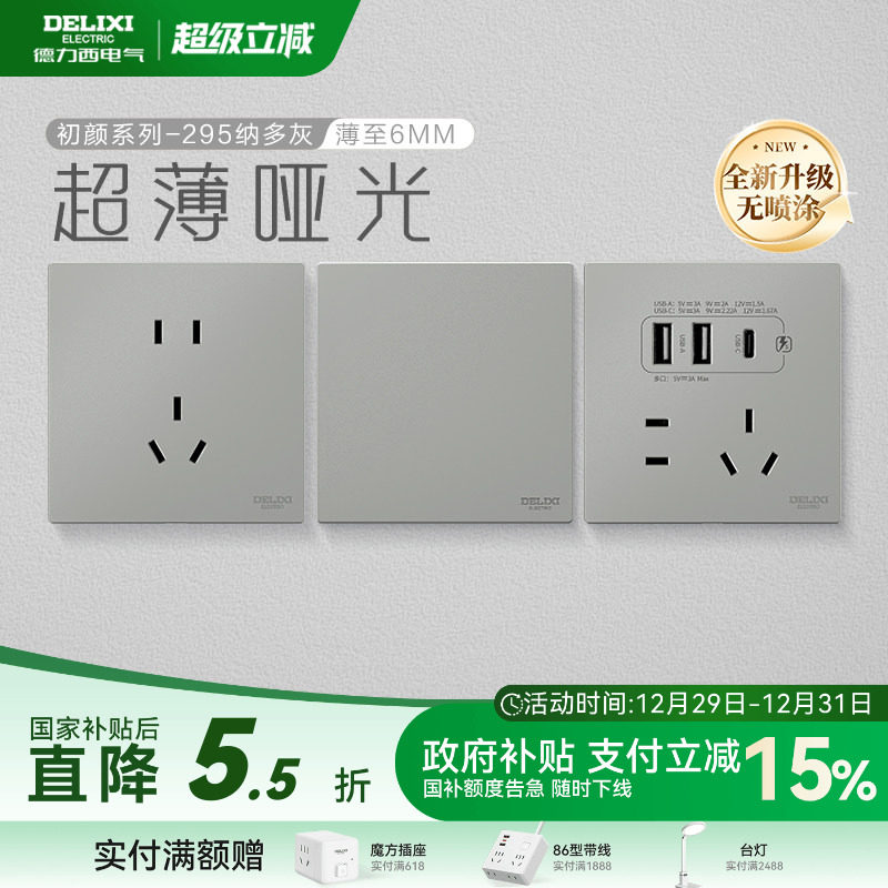 德力西官方旗舰店295超薄开关插座哑光五孔面板16A空调插座纳多灰