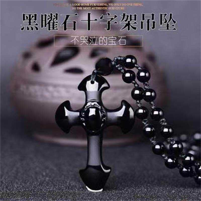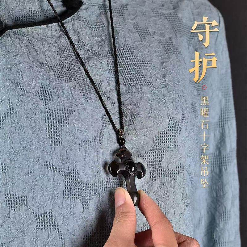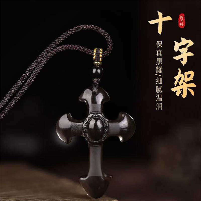 天然黑曜石十字架项链复古款吊坠雕工精湛男女款挂坠礼