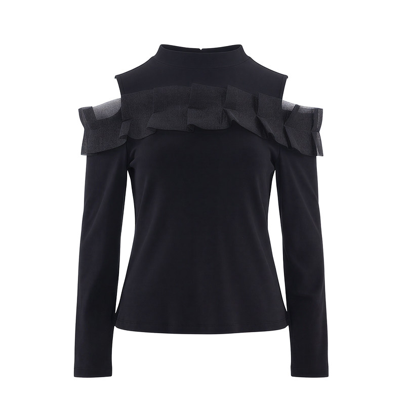 kodice2026春新款圆领棉质露肩针织上衣修身花边长袖小衫气质女装