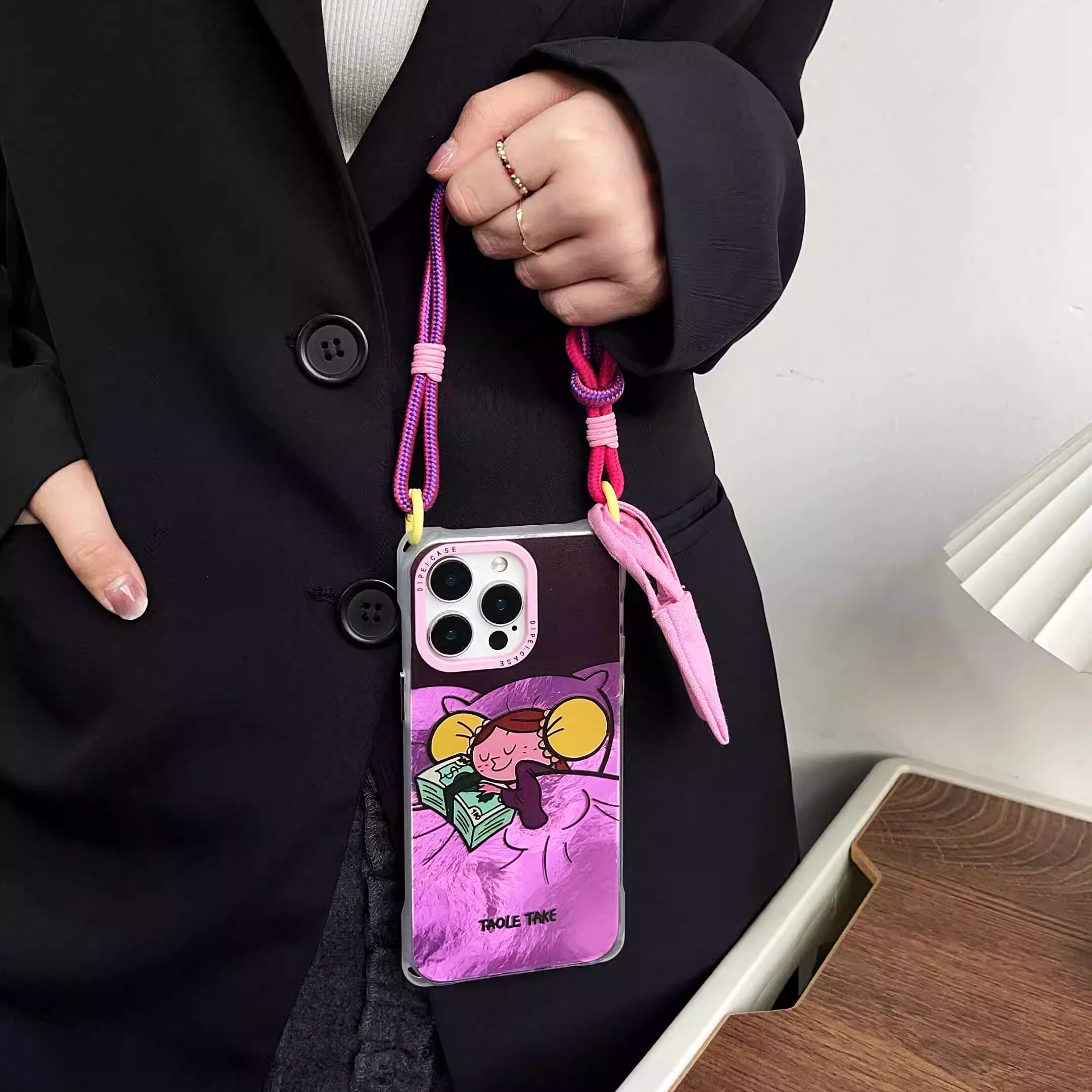 韩系紫色睡觉多金公主适用苹果16手机壳挂绳斜挎可背iphone17promax四角开孔13背带斜跨14手腕手提12小米15