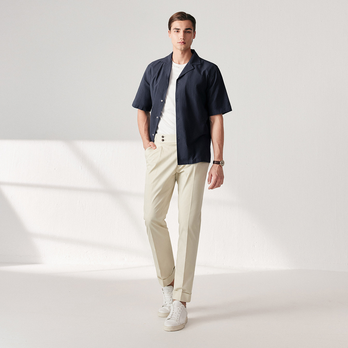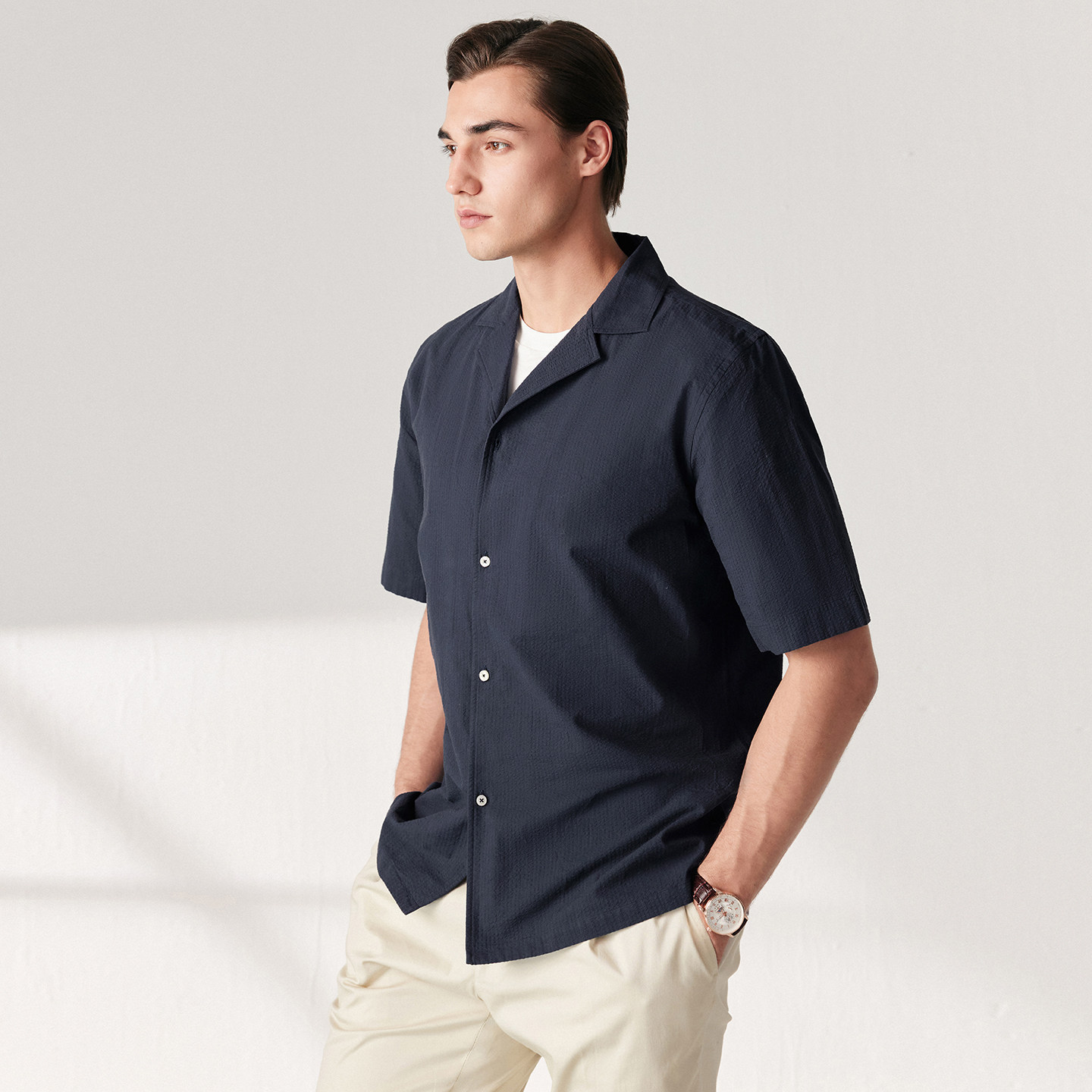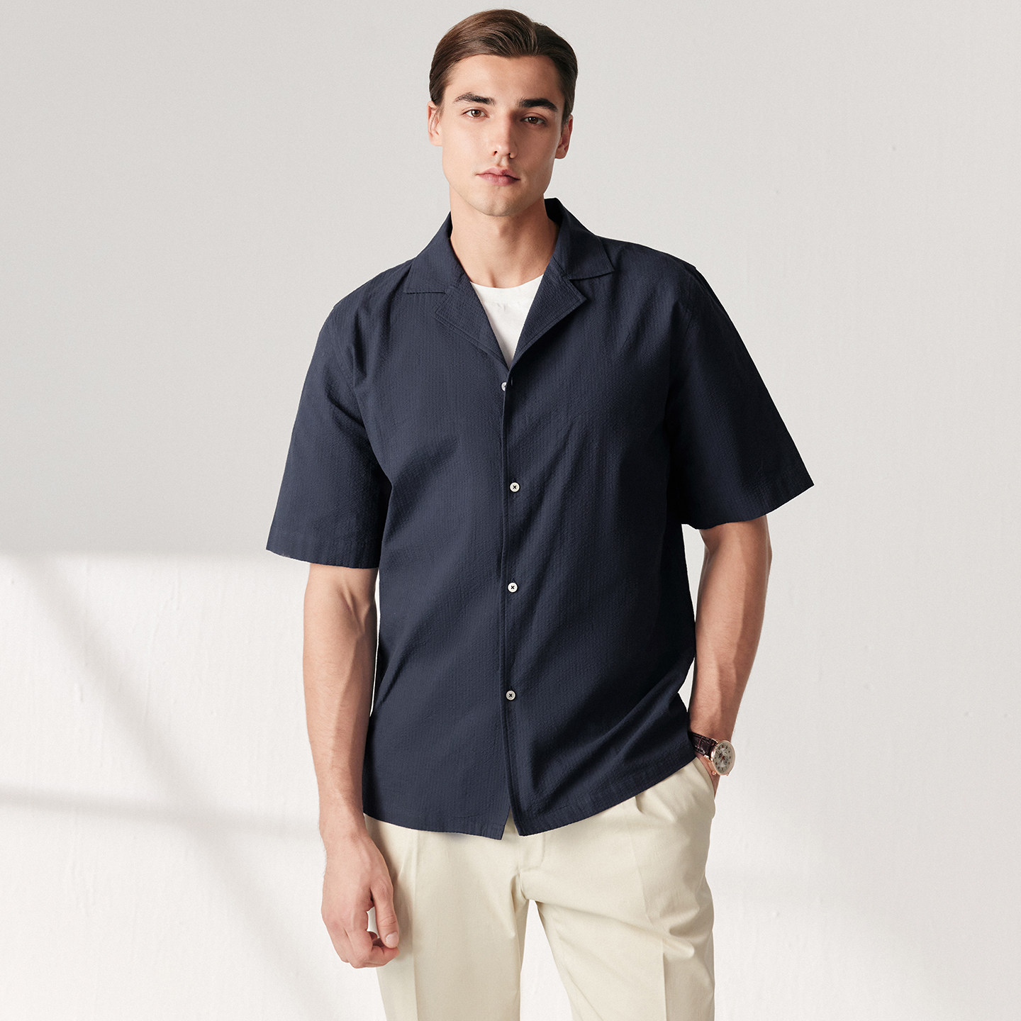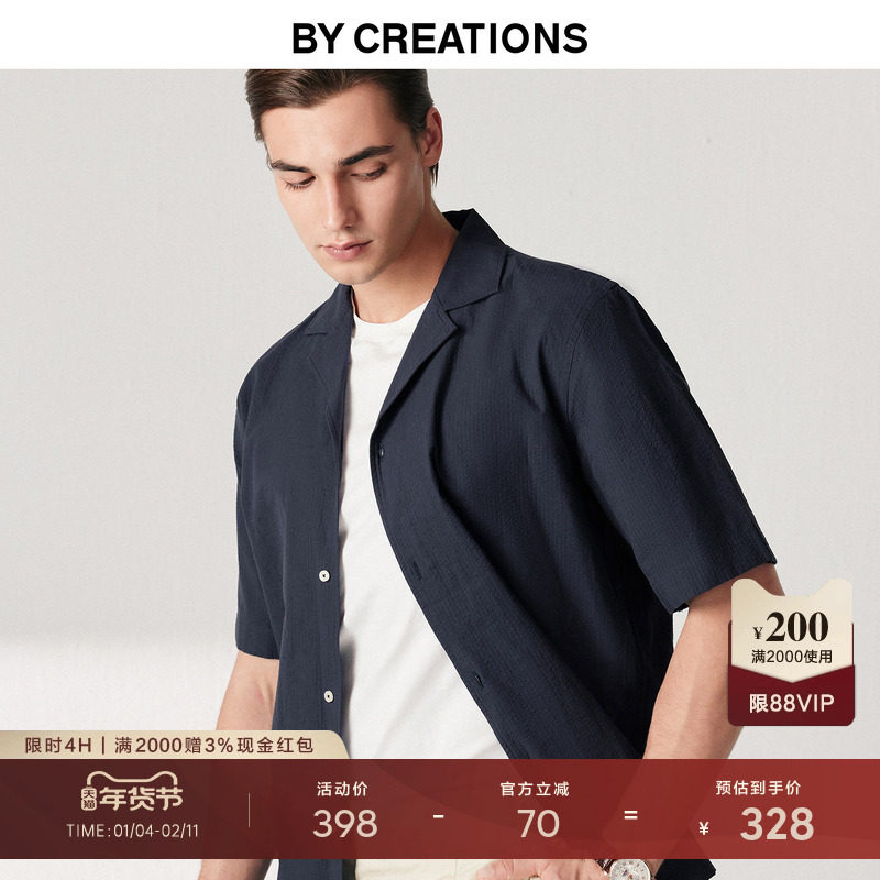 柏品纯棉古巴领短袖衬衫男春季新商务休闲透气泡泡纱复古衬衣外套