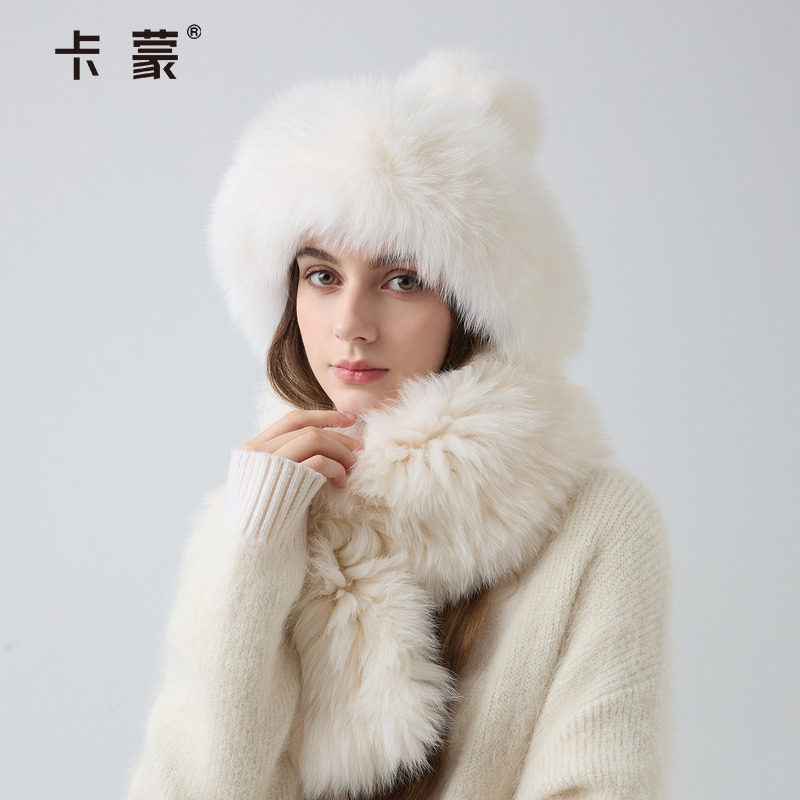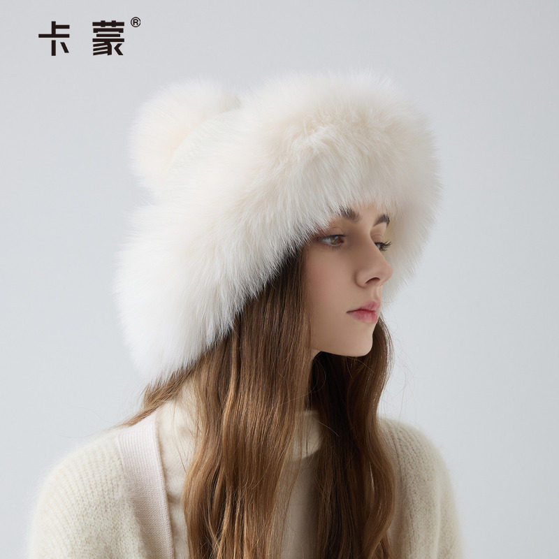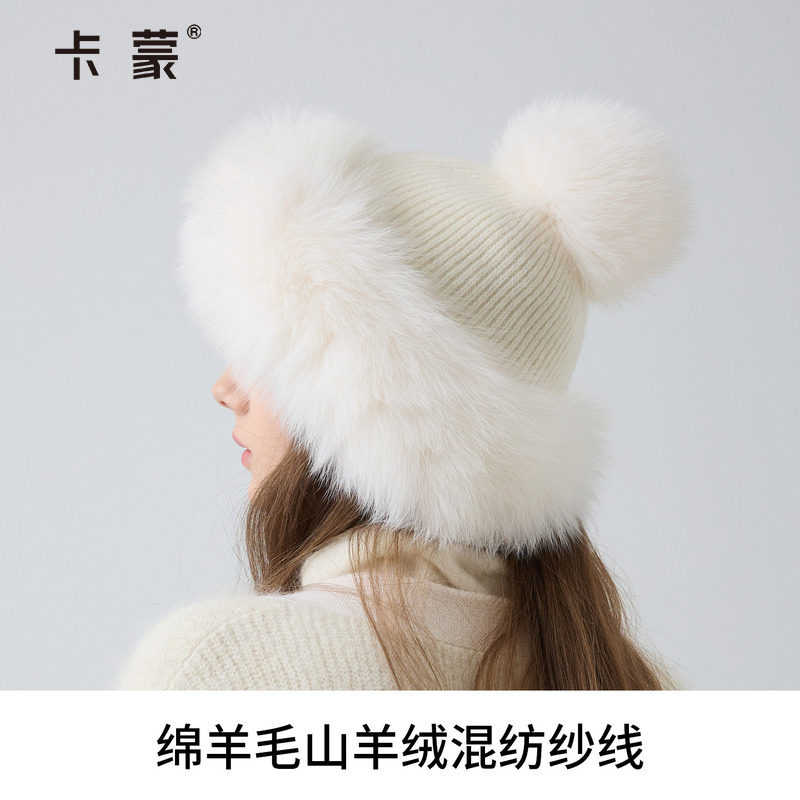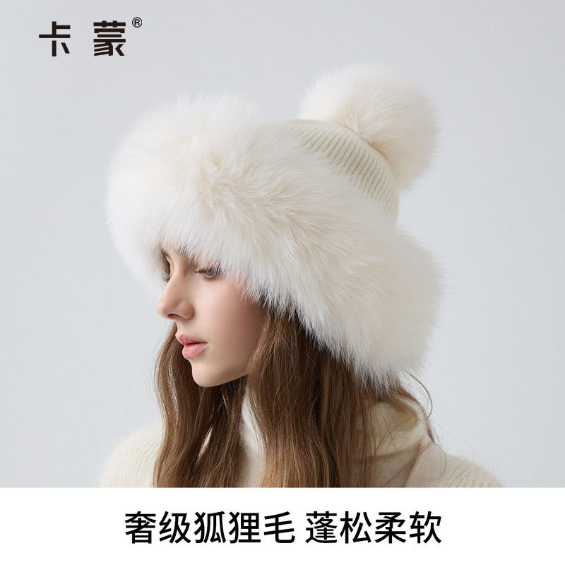 卡蒙2025新款帽子针织帽毛狐狸皮草帽防风放寒保暖护耳帽毛线帽女