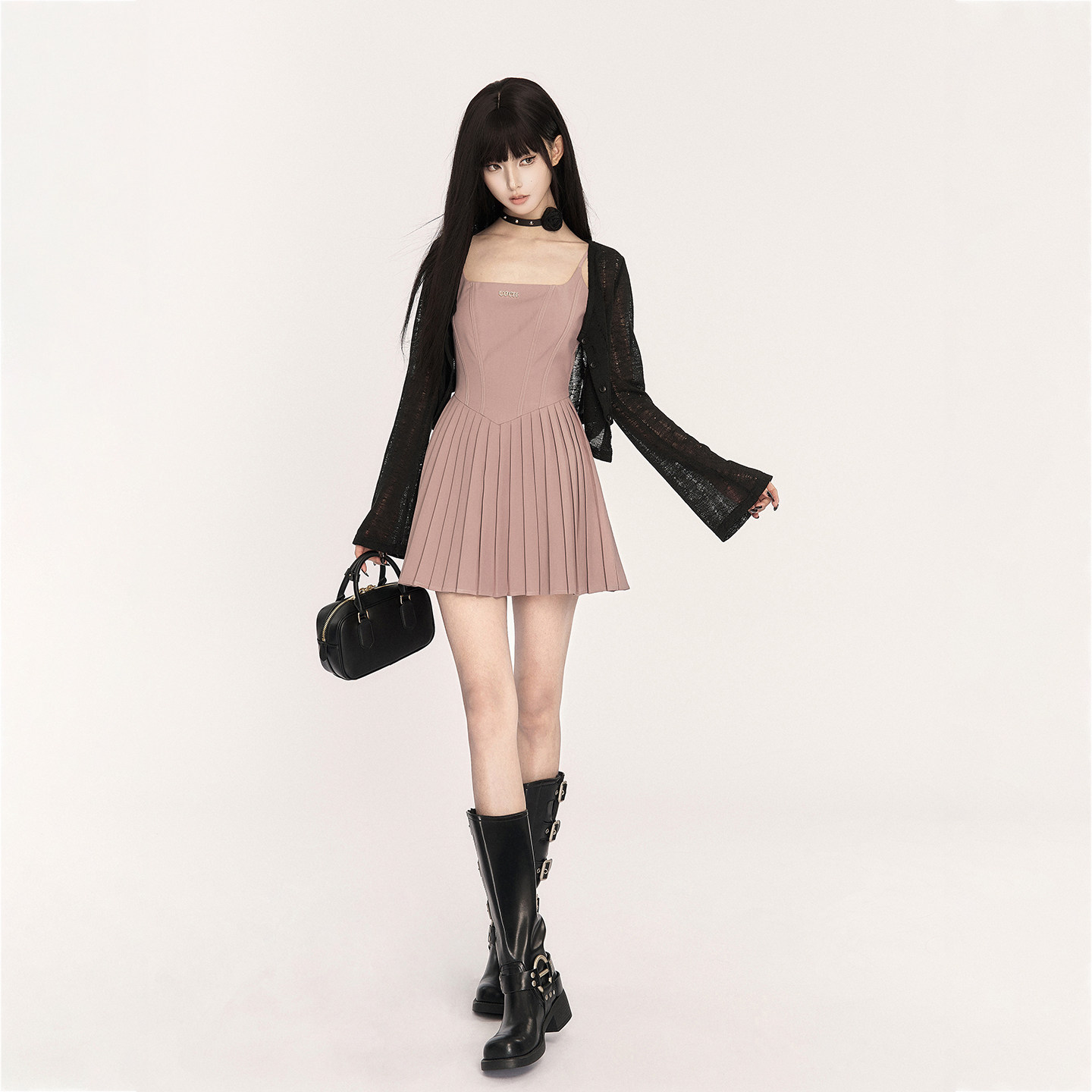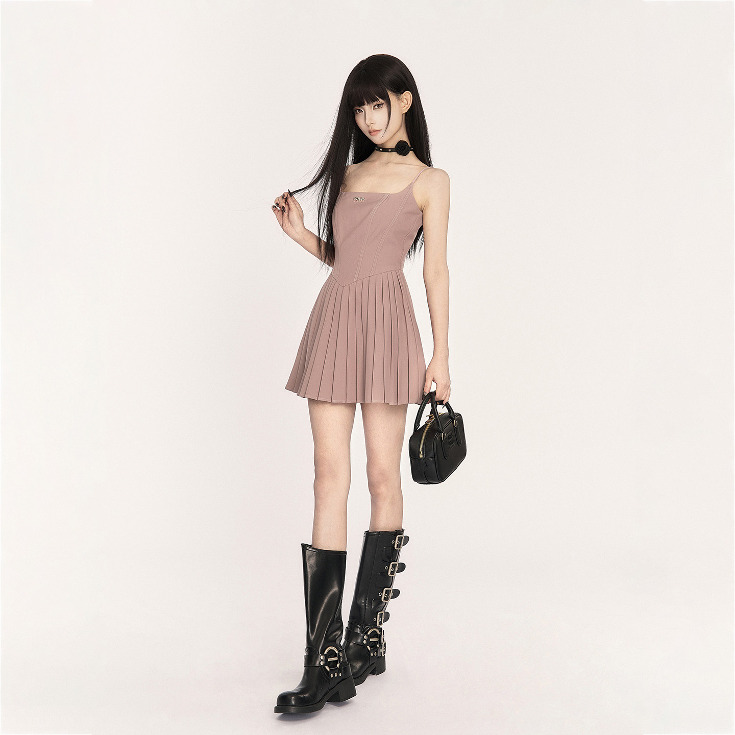 VOCK 满分廓形 甜酷少女芭蕾风方领吊带百褶裙收腰显瘦A字连衣裙