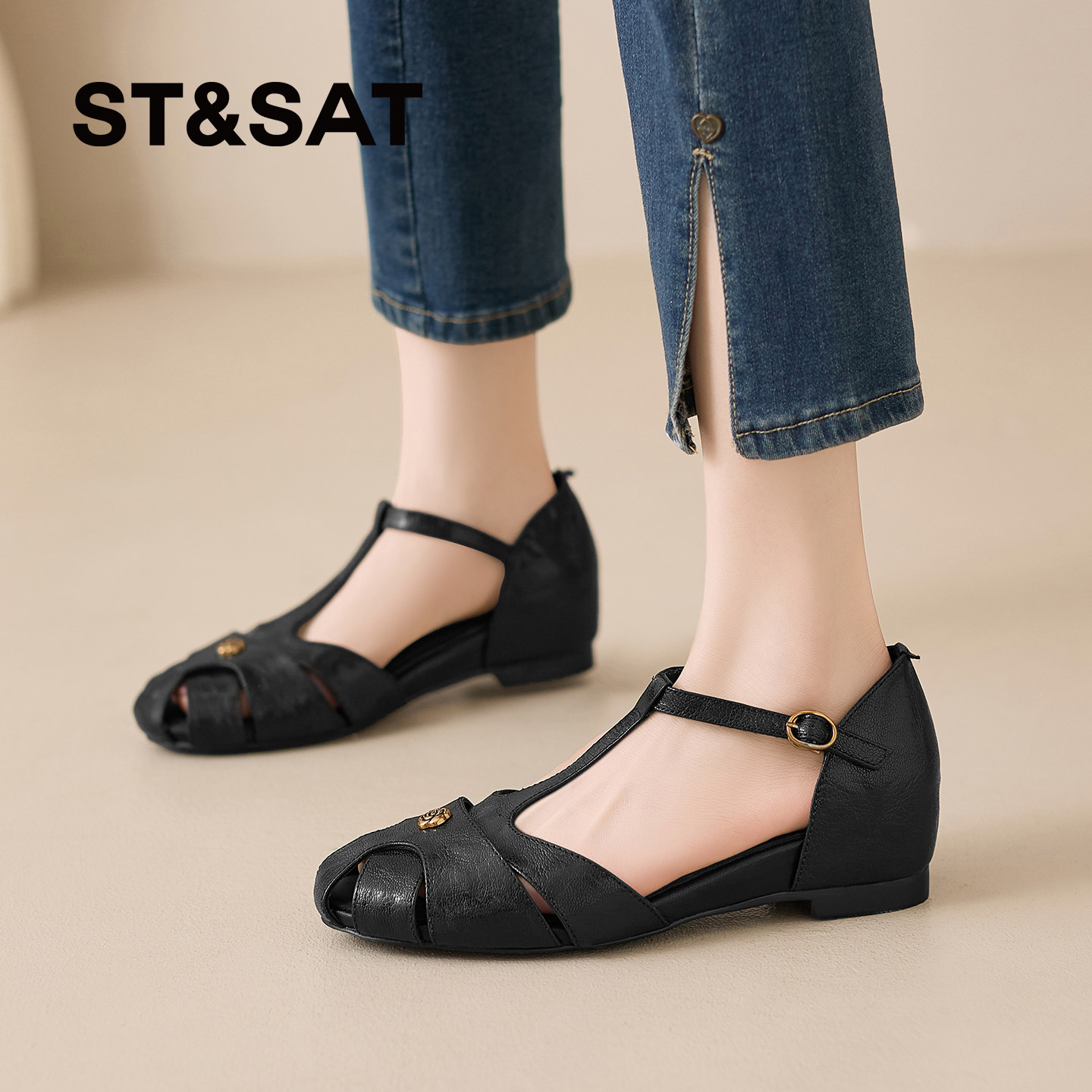 星期六法式复古风镂空包头凉鞋夏季新款真皮圆头T字带内增高女鞋