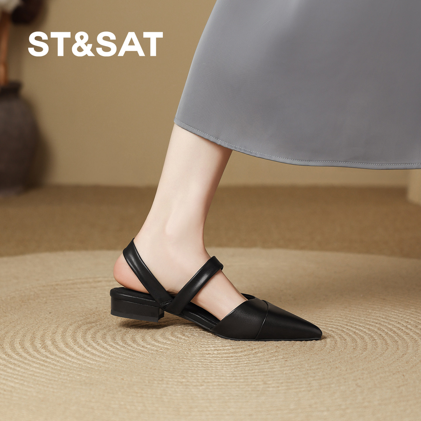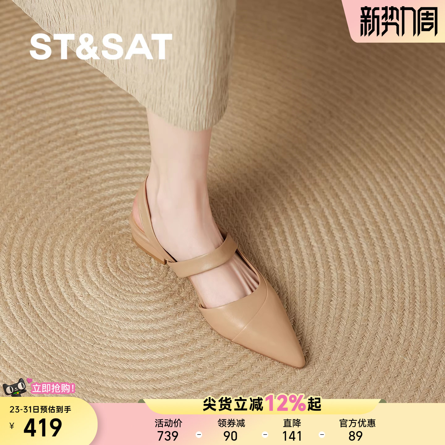 星期六早春漂亮包头凉鞋女2026新款尖头一字带羊皮后空低跟女鞋