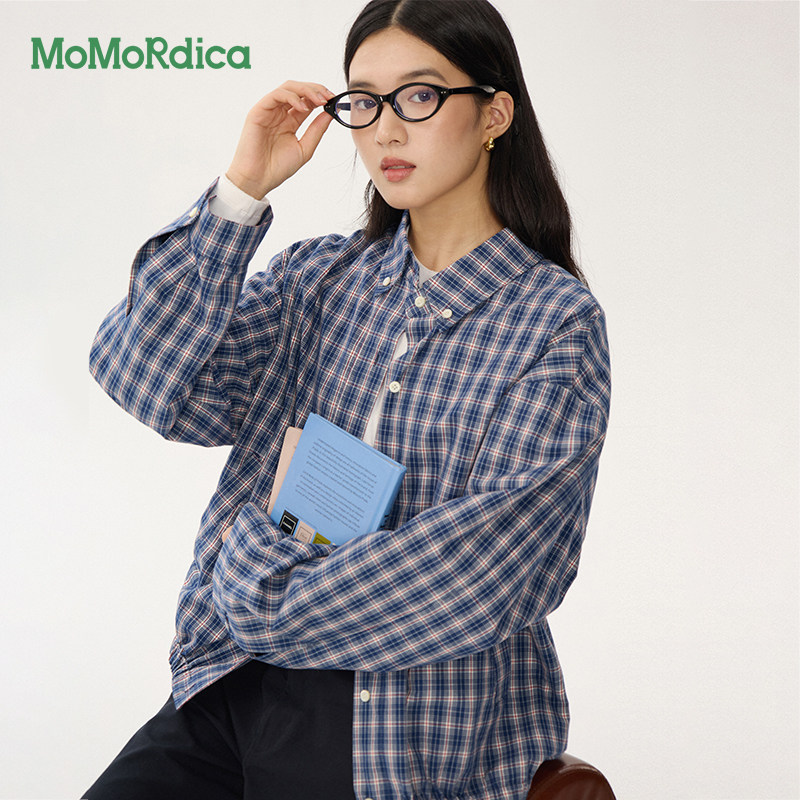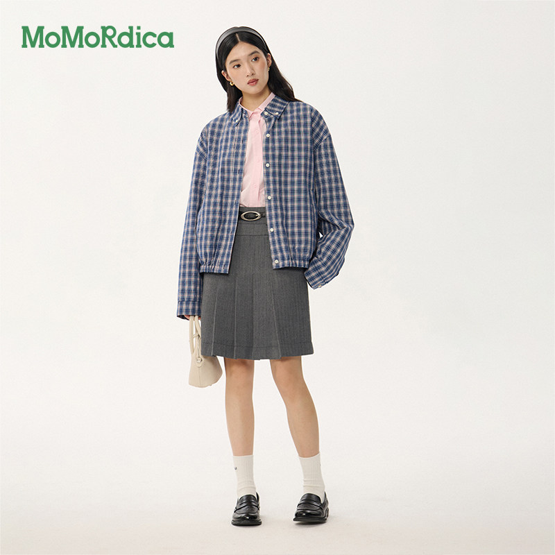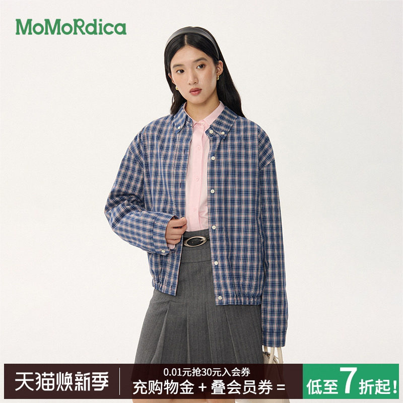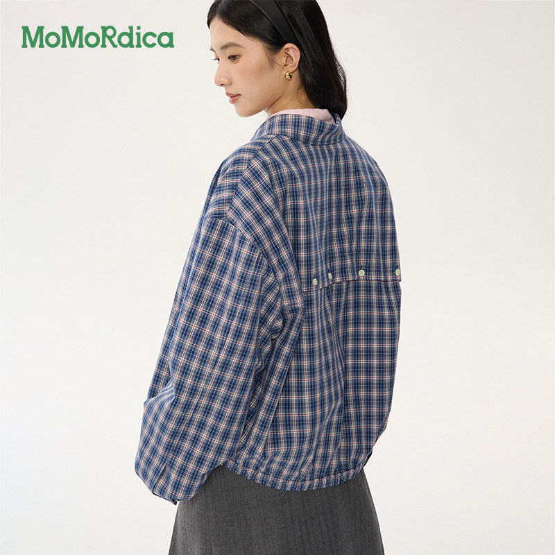 MoMoRdica2025秋季女夹克复古蓝格纹外套棉防风休闲加厚外套洗水