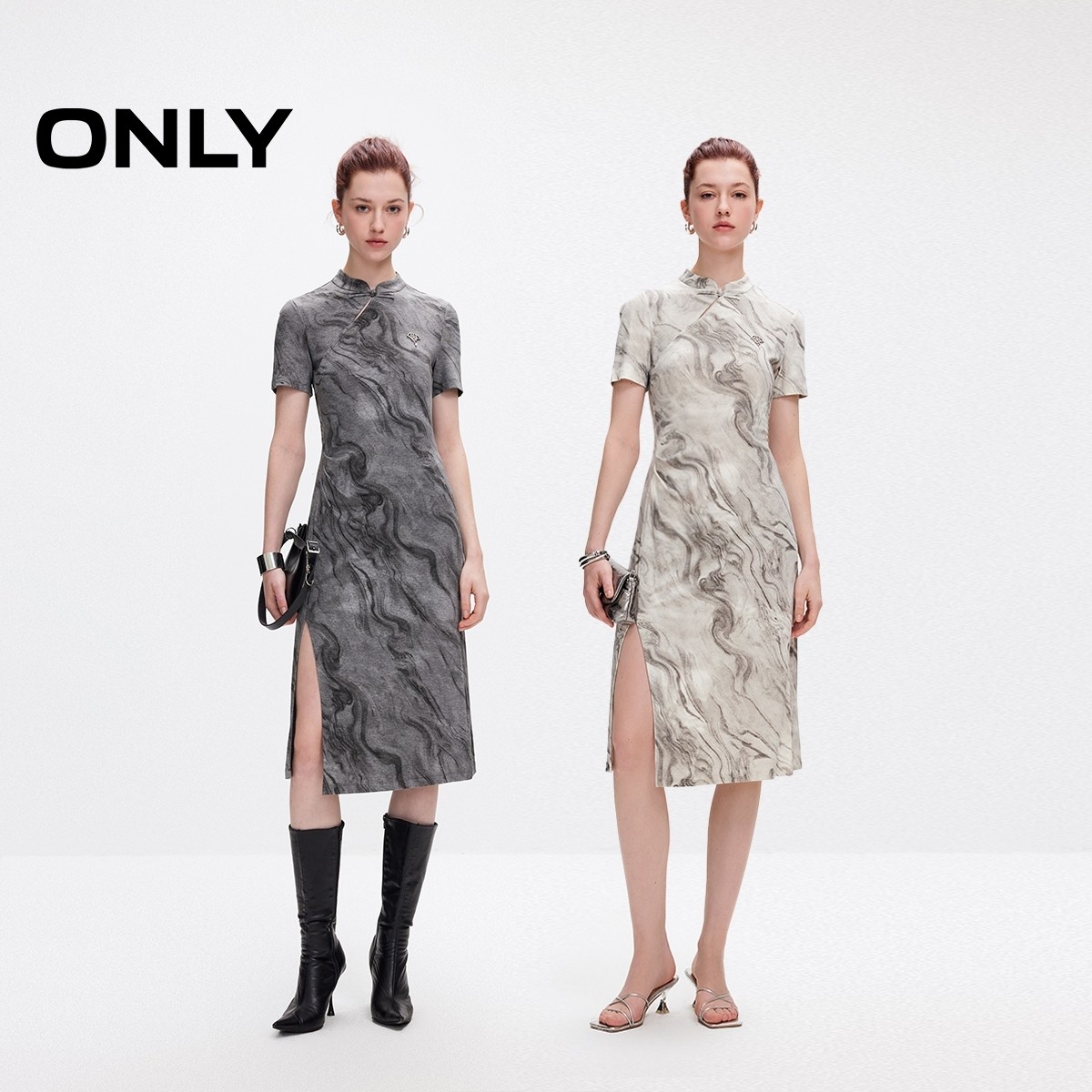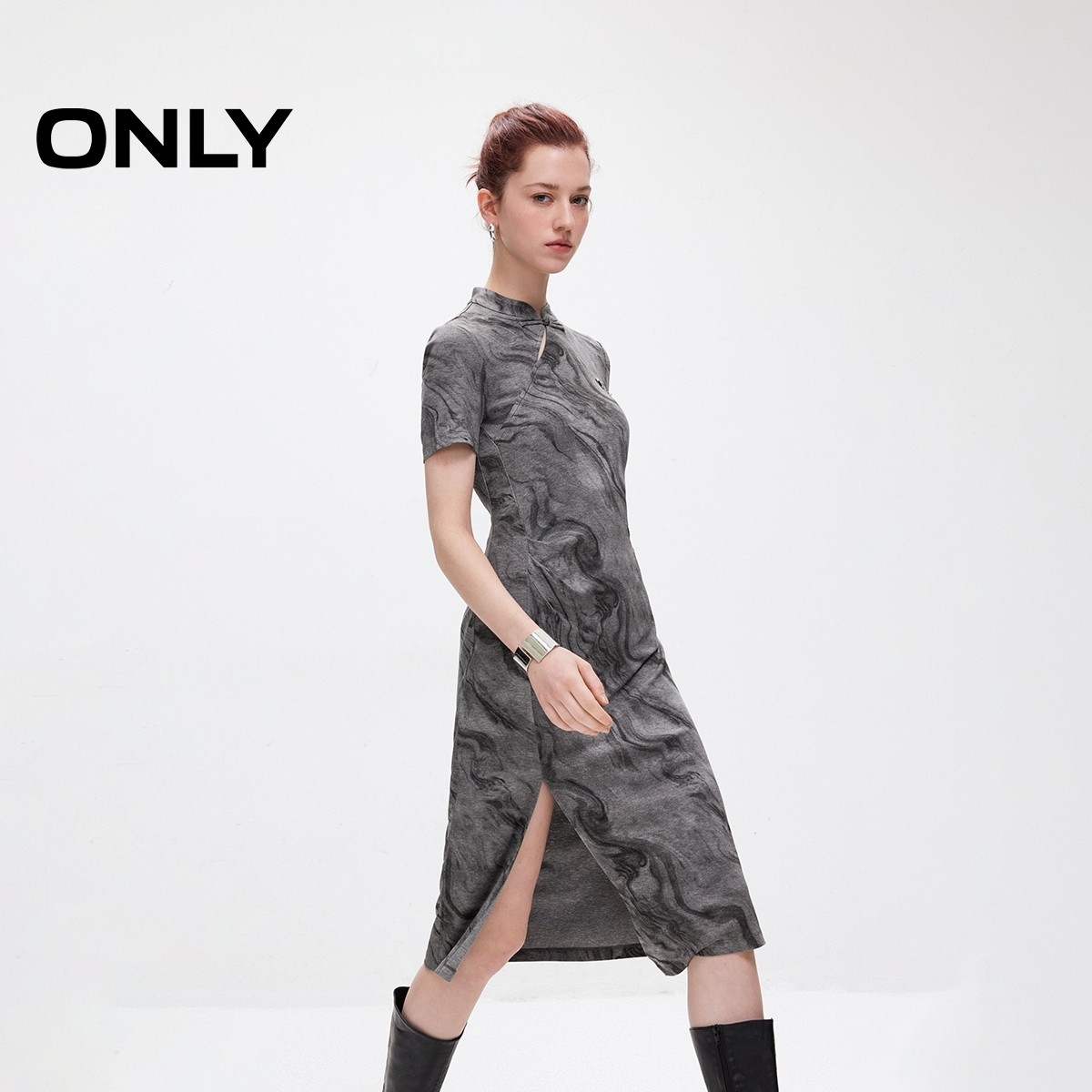 新中式连衣裙 胸前金属装饰 侧开衩下摆