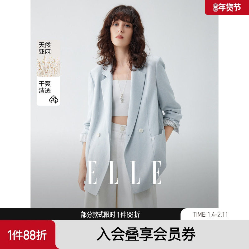 ELLE法式通勤感亚麻西装外套女2025秋季新款高级感正肩宽松西服