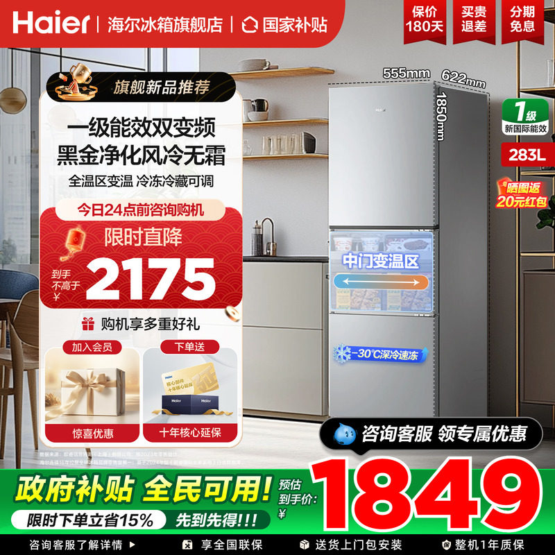 海尔冰箱283升三开门一级能效风冷无霜变频节能小型家用官方正品