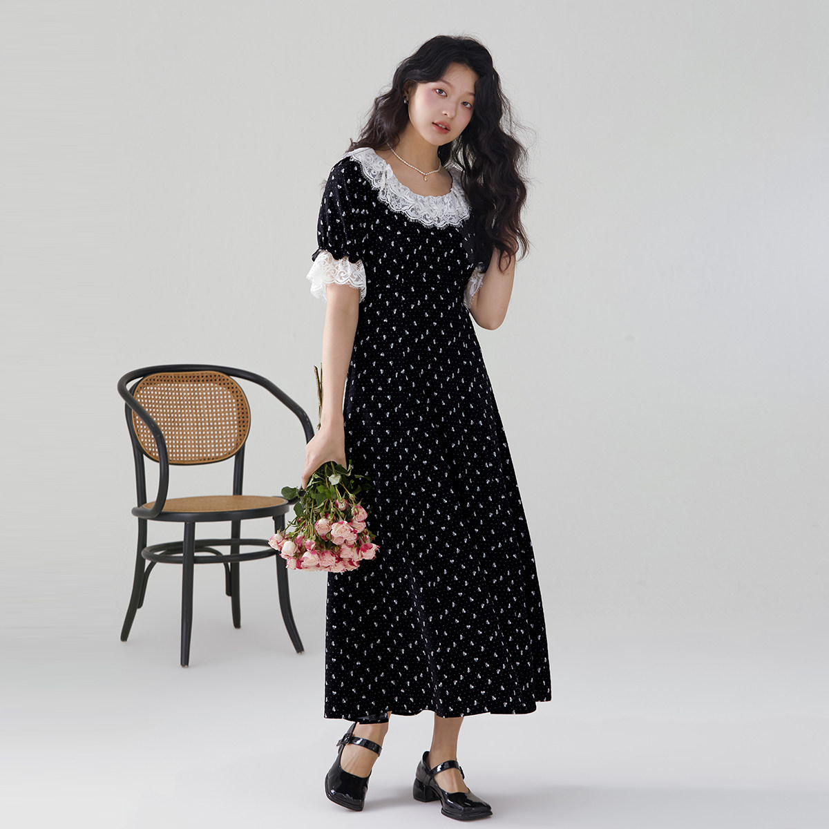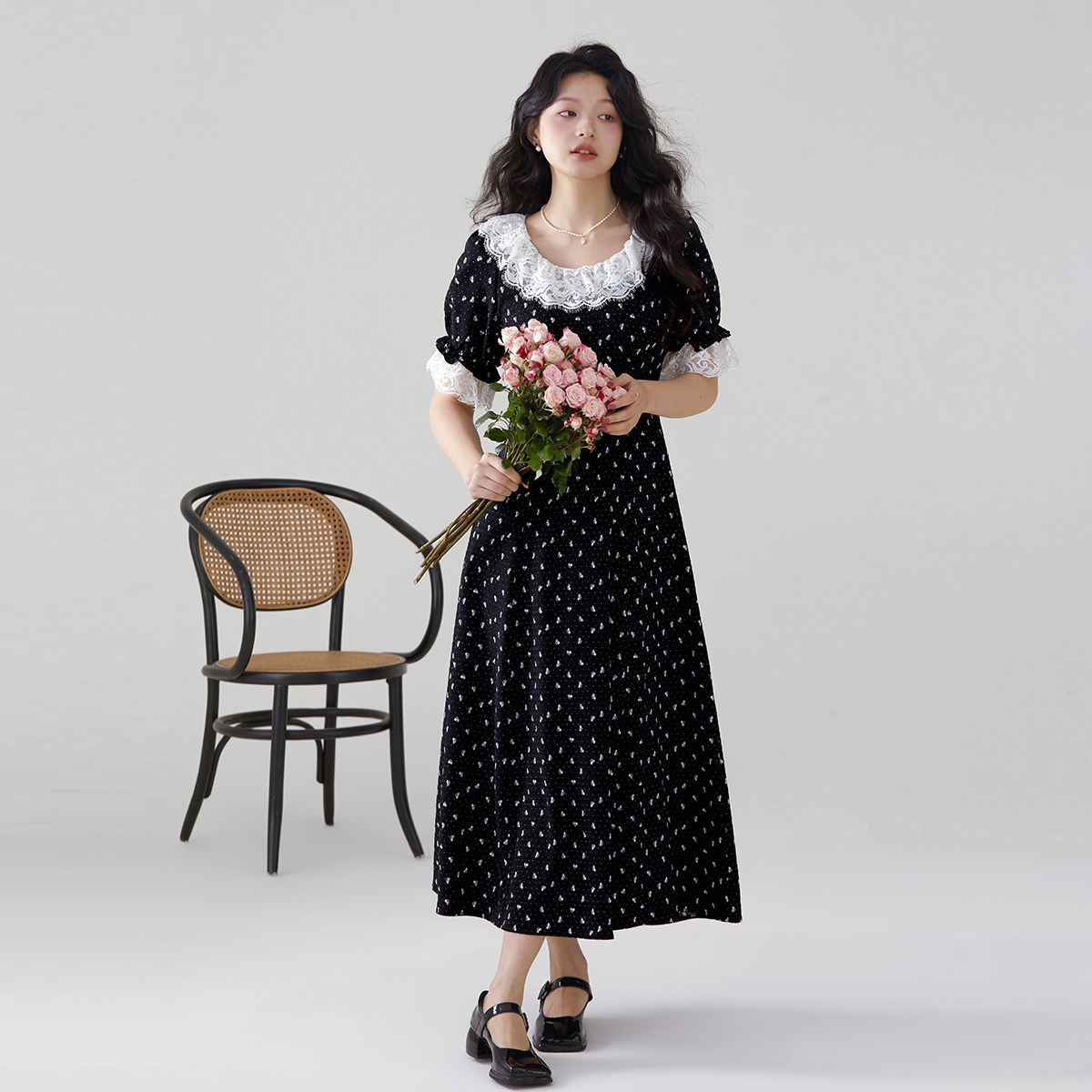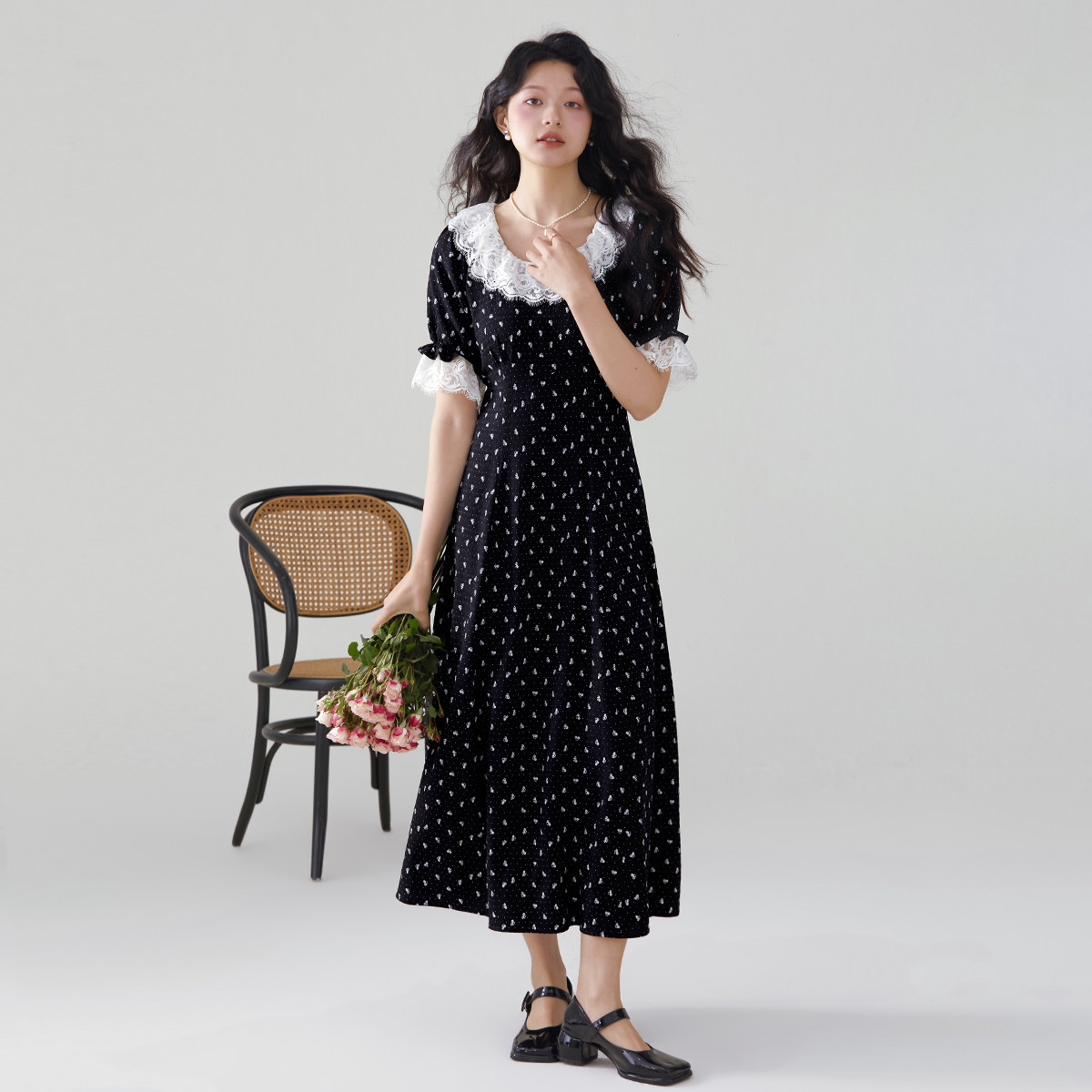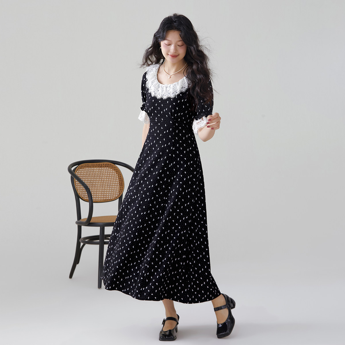 one more2025夏季新款蕾丝拼接碎花裙短袖连衣裙女高级感度假裙子