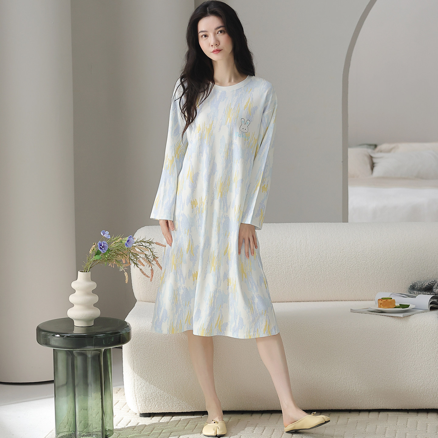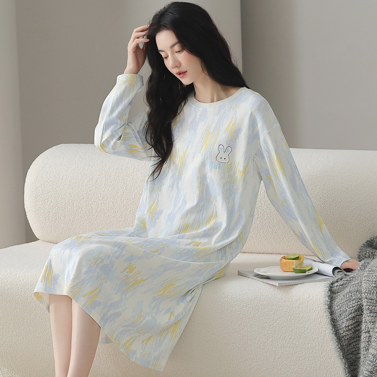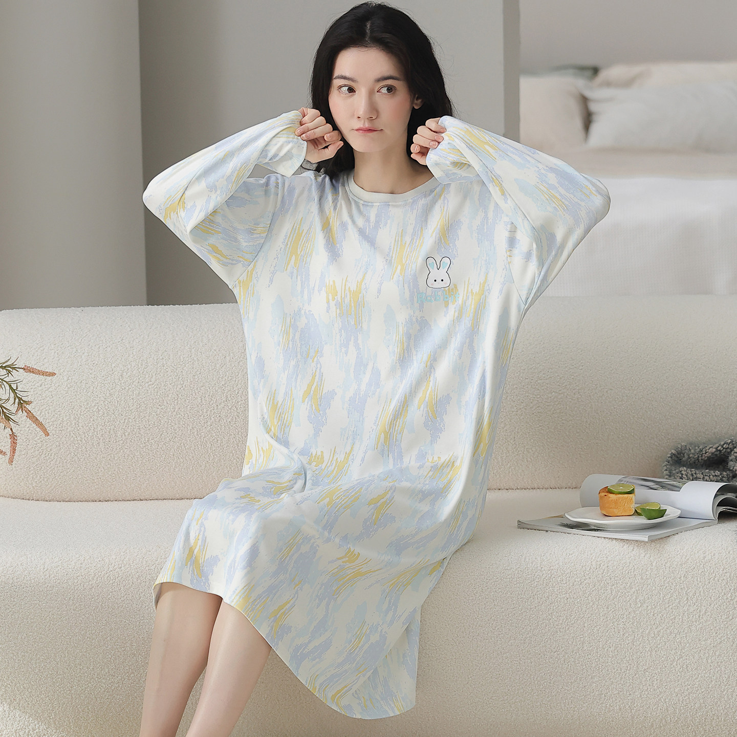 都市丽人2025新款纯棉睡裙女长袖睡衣春秋季卡通小兔家居服可外穿