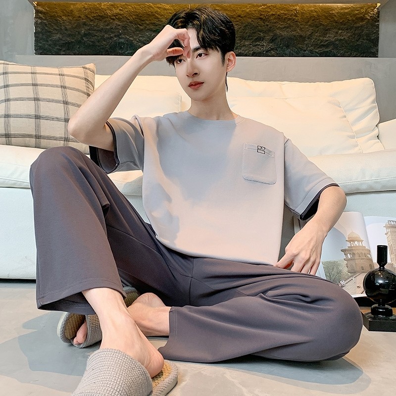帕兰朵短袖长裤纯棉睡衣男款夏天大码套装可外穿夏季家居服男士